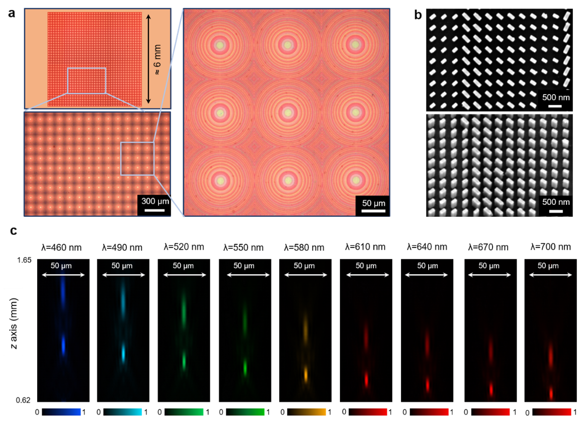 图2(a)超构表面透镜阵列的光学显微图像;(b)SEM图像;(c)双焦超构表面色散效应。