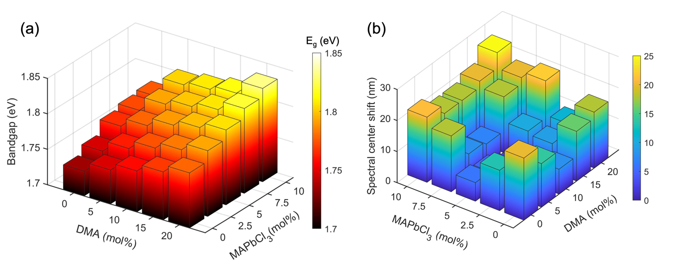 图1. 空间位阻工程实现带隙(a)和光稳定性(b)的协同调控。