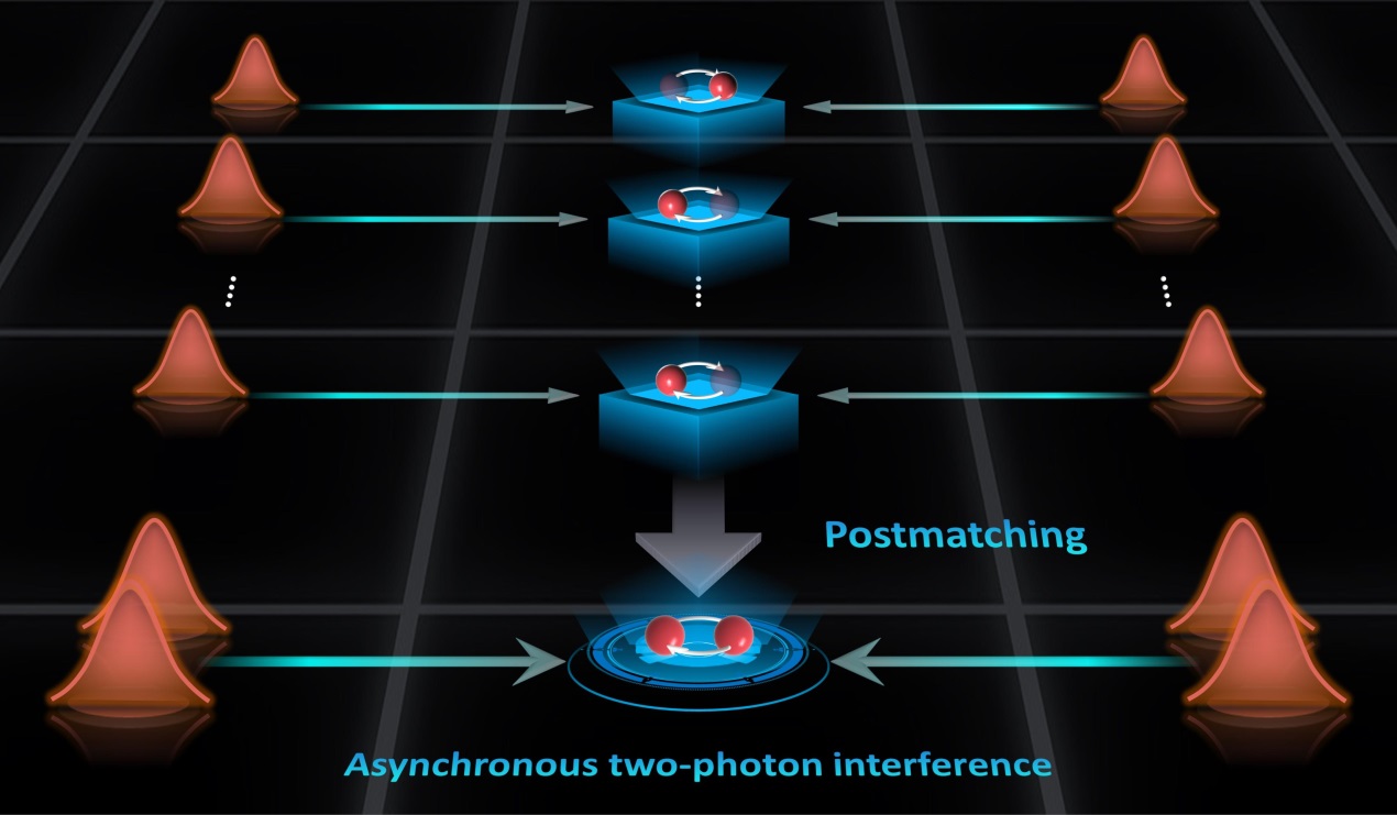受到对偶纠缠的启发,利用后匹配方法巧妙地将同步时间编码转化为异步时间编码,设计出了一种异步MDIQKD协议。 通过随机匹配两个探测到的相位相关联的时间箱,以建立异步双光子贝尔态,从而让双光子干涉的双轨MDIQKD协议打破无中继量子信道码率-距离限制,将理论上的不可能变为了可能。 此外,由于每个时刻之间的相位噪声差在较短的时间间隔内近似相等,可以在不使用相位跟踪和相位锁定技术的情况下对两个与相位相关的时间箱进行后匹配,这大幅降低了实验难度。由于无论选择何种非对称源参数,每个用户的单光子对成分密度矩阵在时间和相位基矢下总是相同的,因此该协议适用于用户可以动态访问而不考虑已有用户源参数的量子网络。