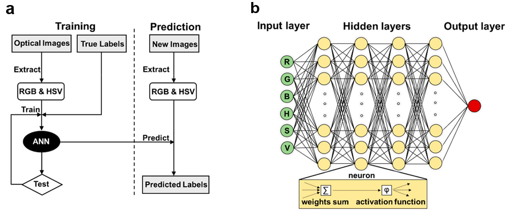 机器学习是一种基于大量数据的计算分析方法,能够通过建立模型自动做出决策,是人工智能的一个重要分支。几十年来,机器学习已经深刻影响到工业与社会发展的方方面面,如人们熟悉的图像识别技术可以快速实现人脸识别、分析生物医学图像等功能。其中人工神经网络(ANN)就是一种快速而高效的机器学习算法,它能通过捕捉光学图像信息中一系列细微差别来对研究对象做出判断。郝玉峰课题组首先通过提取二维材料光学显微镜(OM)图片中每个像素的特征量RGB(红、绿、蓝)及HSV(色调、饱和度、数值)作为算法的输入值,建立了一种基于人工神经网络的模型(图1),该模型可以对8种不同层数的二维材料进行快速分类(图2),平均准确率达96%。