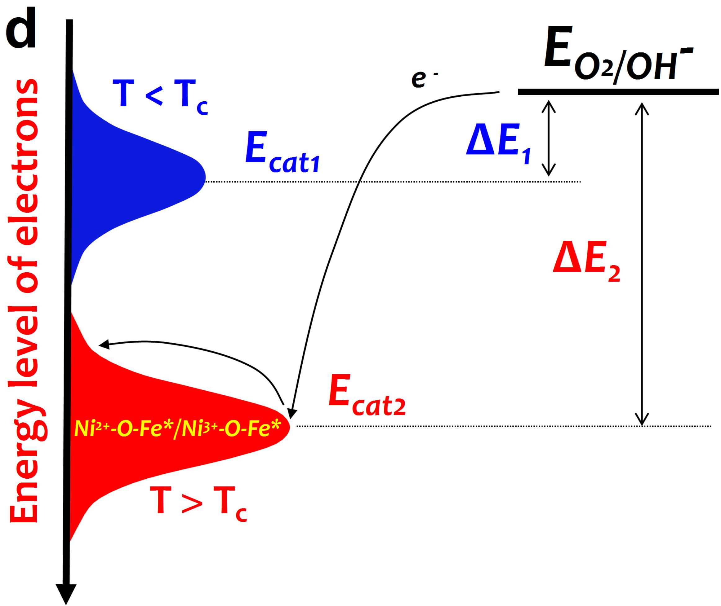 针对以上问题,课题组在对多能耦合制氢研究积累的基础上 (J. Am. Chem. Soc. 2021, 143, 9236; Frontiers in Chemistry, 2022, 10, 902814; J. Phys. Chem. Lett. 2022, 13, 49),提出基于热致物理效应实现高效热-电耦合的可再生能源制氢材料设计理念。以NiFeOxHy (NiFe(OH)2和NiFeOOH的混合物相)电催化剂作为模型催化剂,基于其较低居里温度Tc(70 ?C)设计出一种高效的热-电耦合水分解体系。磁学特性测试研究表明,NiFeOxHy电催化材料在70 ?C发生亚铁磁→顺磁相变(图2a-b),实现了顺磁态的Ni2+/Ni3+氧化和Ni3+氧化水反应,因此有效降低了电子转移势垒,在90 oC下NiFeOxHy的水氧化电流密度达到100 mA cm-2时的电极电位仅为1.392 V。基于热致磁相变的热-电耦合反应中,热不仅仅促进传质过程(Arrhenius方程描述的线性热-电耦合关系),同时也是维持材料电子态的重要参量,因此改变了电子转移势垒并诱发活化能突变(图3a-c)。如图4a所示,NiFeOxHy的亚铁磁-顺磁转变对低品位热较为敏感,从而使Ni2+到Ni3+的氧化具有较低的电子转移势垒。在此过程中,热贡献于电子自旋翻转,有效代替了电力消耗。此外,在顺磁态,低自旋Fe3+具有更多的电子转移通道,更加有利于Fe-O-Ni构型的电子交换相互作用,从而在Ni2+/Ni3+氧化和OER过程中实现高效的电子转移,并以几乎相同的KM和KOER显著加速氧化还原电对媒介的水氧化反应(图4b)。