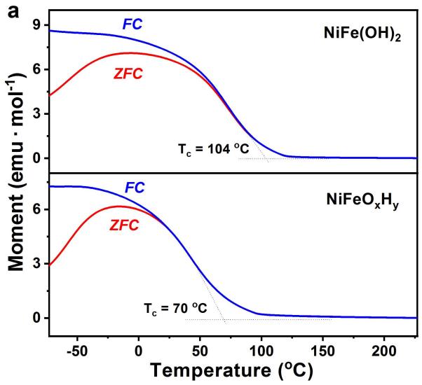 图2. (a)外加磁场强度H为500 Oe下,NiFe(OH)2和NiFeOxHy的零场冷却(ZFC)和场冷(FC)磁化强度随温度的变化函数,(b)不同温度下的M-H磁滞回线。