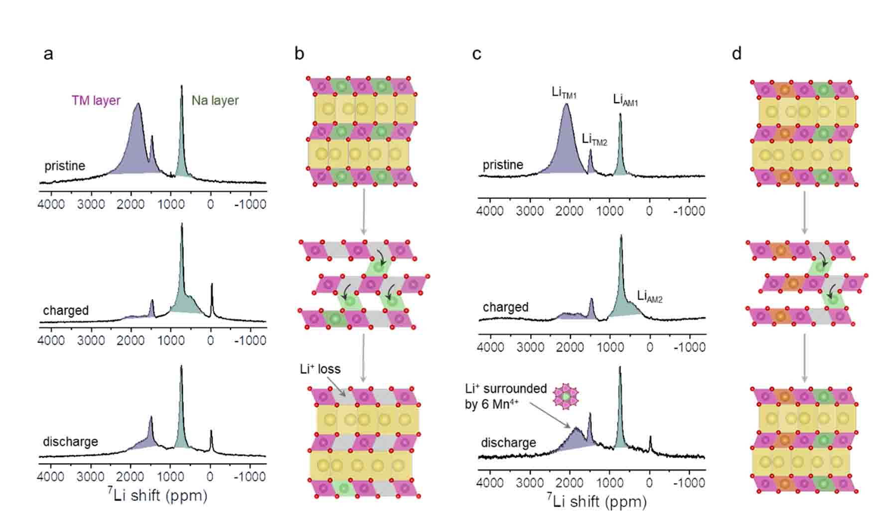 在LiMn6-MgMn6材料中,[Li1/7Mn5/14]超晶格单元激活了晶格氧氧化还原活性,使得正极材料在首圈放电表现出285.9 mA g-1的可逆容量。密度泛函理论(DFT)计算、X射线吸收光谱(XAS)和X射线光电子能谱(XPS)测试表明O参与了氧化还原反应。[Mg1/7Mn5/14]超晶格单元有利于结构和阴离子氧化还原的可逆性,在高度脱钠的状态下,Li+从TM层中迁移至Na层,Mg-6Mn超晶格起到支柱作用,防止了空位团簇、氧气析出和结构破坏,从而保持了良好的结构可逆性;在1C (100 mA g-1)电流密度下循环50圈后保持了85.5%的容量。原位X射线衍射(XRD)也显示了其良好的结构可逆性。核磁共振(NMR)测试表明Li+可逆地穿梭于Na层和过渡金属层之间,与Na0.78Li0.26Mn0.74O2形成明显对比。