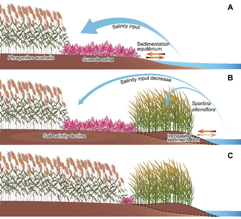 研究团队首先通过解译江苏盐城湿地珍禽国家级自然保护区核心区40年的Landsat遥感影像,发现在互花米草定殖并占据低潮位区域后的5年后,中潮位的盐地碱蓬群落(图1)面积开始表现出快速萎缩趋势。有趣的是,碱蓬盐沼的萎缩并非由外来种互花米草直接侵占,而主要是由高潮位的本地种芦苇扩张侵占导致。研究团队进一步通过综合分析植被分布、高程、沉积物、土壤盐分等数据,构建了基于种群增长、空间扩散、种间竞争和生物—地貌反馈等基本生态过程的偏微分方程理论模型,揭示了盐分介导的长距离相互作用是近年来碱蓬盐沼快速萎缩的关键驱动机制(图2):米草具有发达的地下根茎系统,能够通过捕获沉积物促进低潮位的沉积过程从而导致高程的局部抬升,从而对潮水产生阻抑效应,减少中潮位的水淹时间和盐分输入;分析发现,这种作用虽然短期内较为微弱,但其长期积累效应可能导致中潮位土壤盐分下降到适合芦苇生长的临界阈值(与遥感观测的5年时滞期一致),从而显著改变芦苇和碱蓬之间的竞争关系,即具有较强竞争力的芦苇快速占据原先高度盐渍化(只能生长耐盐程度较高的碱蓬)的中潮位滩地,最终导致碱蓬盐沼系统丧失。模型分析表明,在数十年的时间尺度上,这种长距离相互作用最终能够深刻改变该区域滨海湿地的生态系统稳态和韧性。