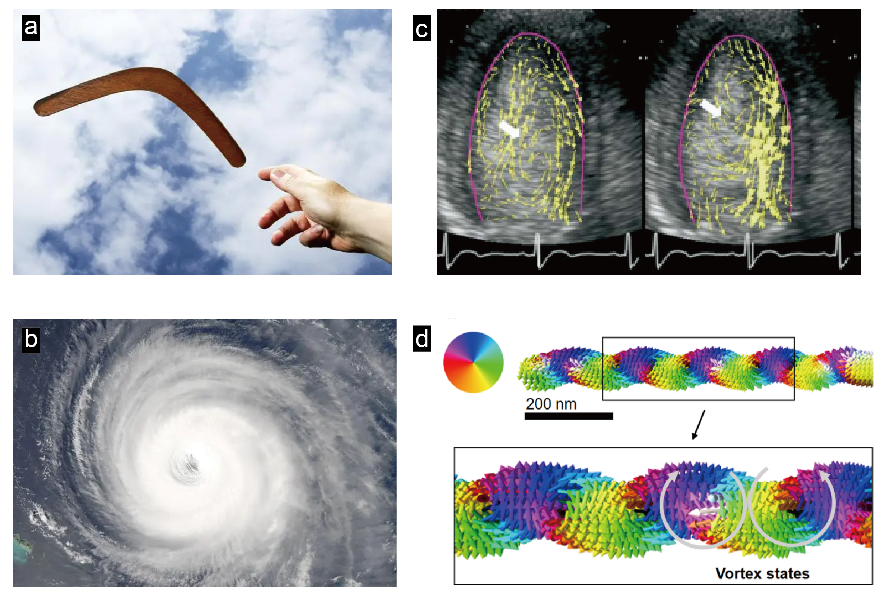图1. 在自然界和其他物理体系中广泛存在的横向涡旋结构。(a)回旋镖的运动;(b)热带气旋;(c)人类心脏的血流;(d)磁性纳米线中的涡旋畴壁