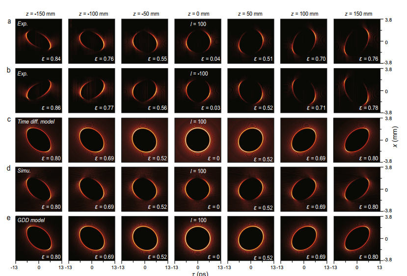 由于所采用的x–ω调制方案已经规避了模式退化对其演化的影响,研究者进一步证明上述动力学可以由时间衍射积分模型来描述(图4c)。值得注意的是,该结果也是时空涡旋上纯时间衍射效应的首次实验观测。进一步地,受到时空涡旋中kl与kz存在着强耦合的启发,研究者引入了一个内禀色散因子,从而可以通过群延迟(GDD)积分模型直接计算时空涡旋光的传播动力学。如图4所示, 基于GDD模型的结果,与实验、时间衍射模型、以及数值仿真的结果均吻合,证明了其有效性。基于此,研究者还在理论上提出并研究了利用色散工程获得无时间衍射横向轨道角动量光束的可行性。
