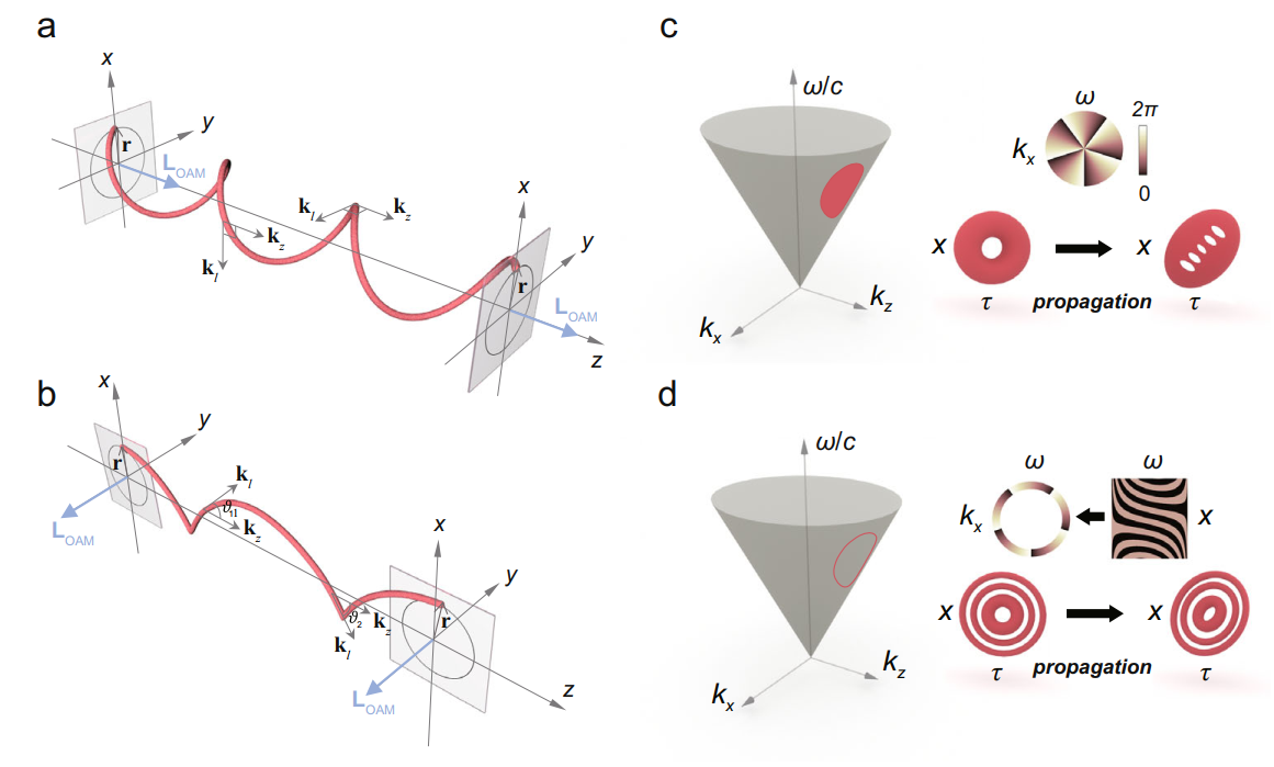 图2. 纵向与横向 OAM 光束的波矢分析对比,揭示了横向OAM中存在的内禀的强时空耦合。