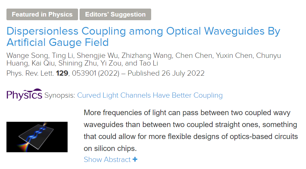 该成果以"Dispersionless Coupling among Optical Waveguides By Artificial Gauge Field"为题发表于物理学顶级期刊(Phys. Rev. Lett. 129, 053901 (2022))上。文章同时作为Editors’ Suggestion和Featured in Physics在PRL网站首页重点推荐。《Physics》杂志以"Curved Light Channels Have Better Coupling"为题发表亮点报道。该论文通讯作者为凯发k8官网现代工学院李涛教授,第一作者是现代工学院助理研究员宋万鸽博士,合作者包括上海科技大学邹毅教授。该工作得到祝世宁院士的悉心指导。审稿人认为该工作"in an interesting way it is demonstrated how fundamental physics effects that were first discovered in the context of solid state systems with non-trivial topological characteristics, can be applied to improve existing photonic devices."(该工作有趣地展示了如何将原先在凝聚态系统中发现的拓扑效应用于提升现有的光子器件的性能上)。相关技术已经申请中国发明专利并获得授权(专利号:ZL202010690095.X),并已申请英国发明专利(公开号:2602757)。该研究得到了科技部国家重点研发计划、国家自然科学基金委、凯发k8官网登峰人才计划等项目的支持。