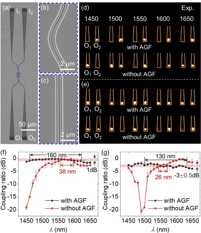 在实验中,研究人员加工了设计好的弯曲硅波导样品,并以直波导样品作为对照。可以看出,弯曲波导体系对于不同波长都能保持良好的定向耦合器功能,而传统的直波导只在设计的1550nm处可以工作,并表现出较大的波长依赖性(图3)。基于同样的原理,研究人员进一步设计和加工了一个50:50分光比的弯曲波导样品,其同样也表现出很好的宽带性能。根据实验数据,弯曲波导器件的1dB带宽约为160 nm,而传统样品仅为约38 nm。