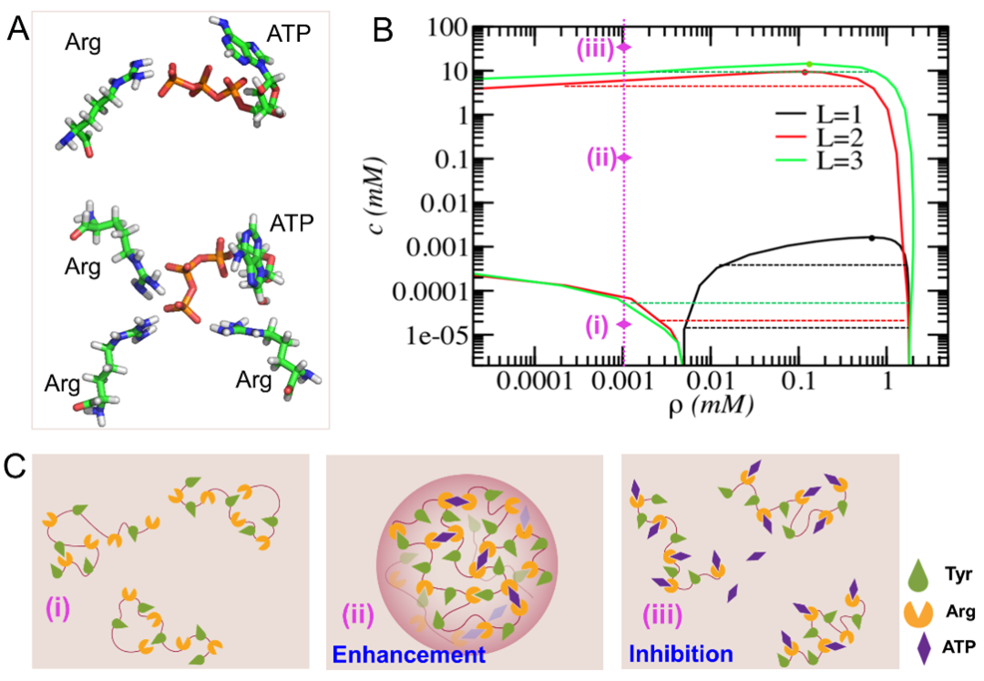 图2. ATP对蛋白质相分离的影响。(A)蛋白质氨基酸与ATP间的微观作用模式;(B)存在ATP情况下的蛋白质体系相图;(C)ATP对蛋白质相分离影响的示意图。