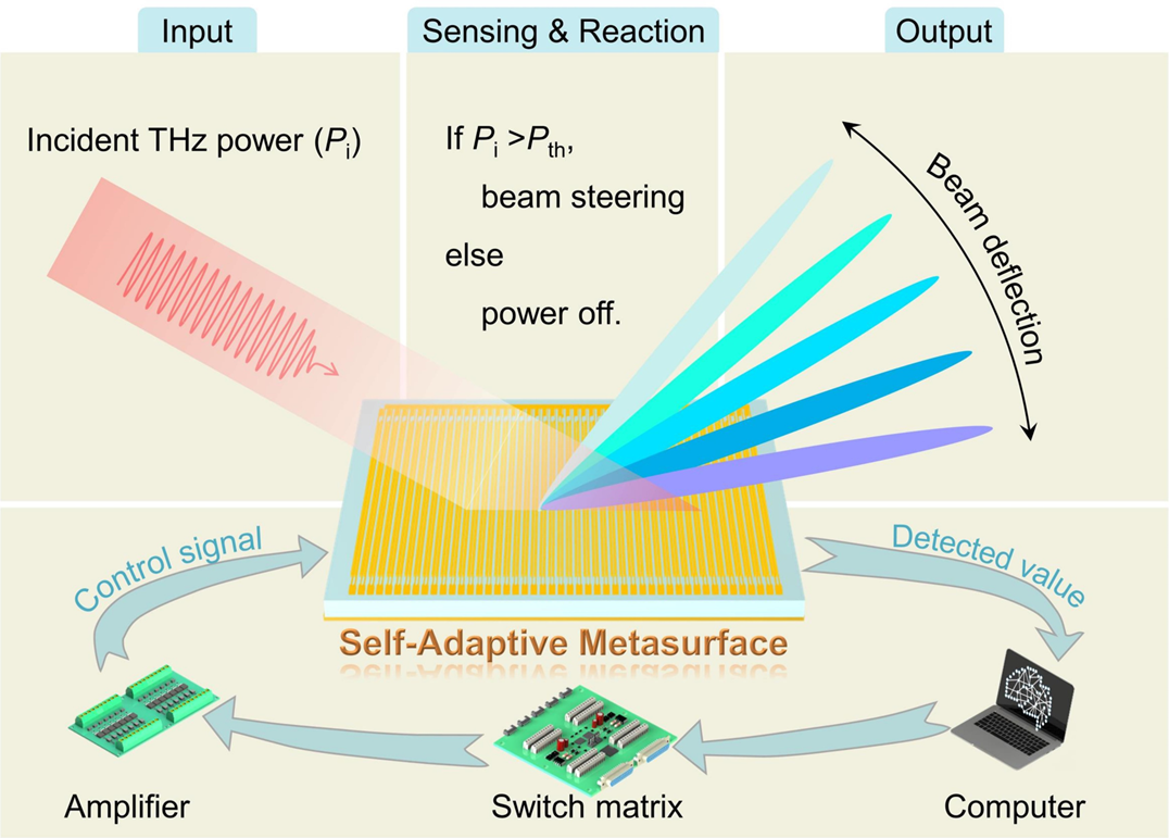 如果给可编程超表面赋予一双"眼睛",它自身能够感知周围电磁环境并做出响应,这种智能超表面无需人工介入就具备全天候的电磁调控能力,在无线通信信道的建立和调整、自适应电磁隐身等实际应用场景中有着巨大的应用潜力。当前,微波段的智能超表面已有报道,但这些超表面器件大多需要借助外部检测器实现环境的探测感知,难以实现集成化。在太赫兹和光学波段,微波段常用的半导体开关元件无法使用,智能超表面亟待开辟新的技术方案。此外,低成本太赫兹检测器的匮乏也使得太赫兹智能超表面的开发面临困境。