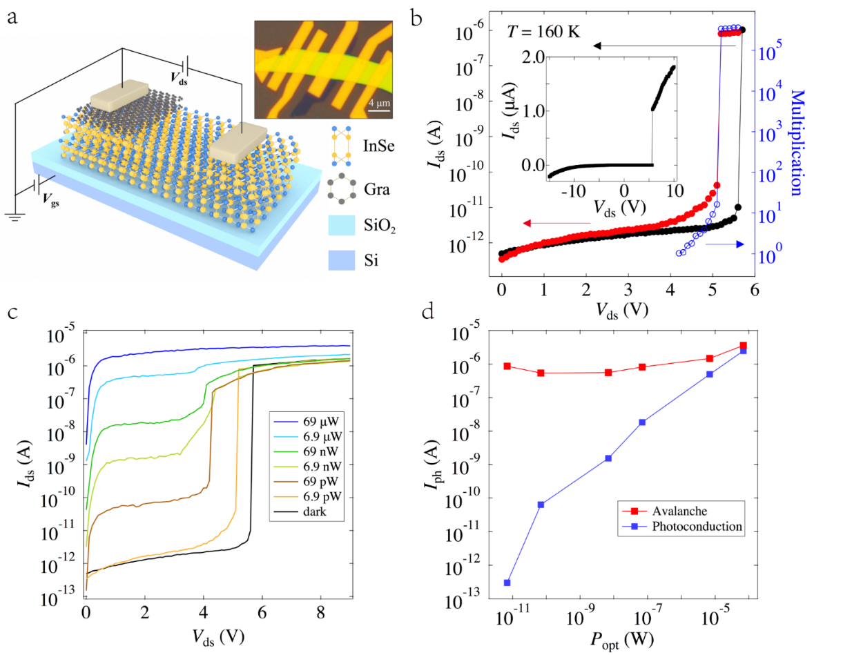 近日,凯发k8官网物理学院梁世军、缪峰团队成功制备了石墨/硒化铟(graphite/InSe)范德华肖特基光电探测器,首次在实验上实现了本征击穿电压下的超高雪崩增益,为低能耗、高灵敏的新型弱光探测器的开发提供了一条可行的技术途径。