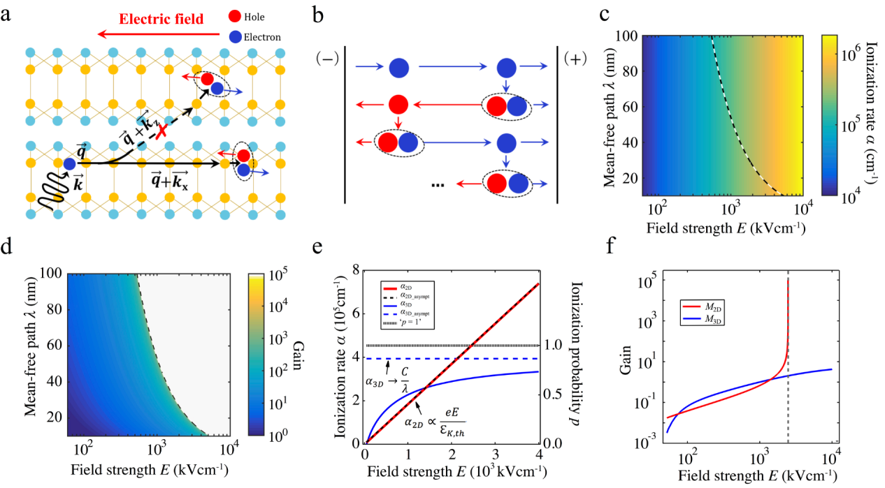 图2.(a)范德华材料中电-声子散射维度降低的示意图。(b)双类型载流子参与的碰撞电离过程示意图。(c)电离率和(d)增益作为电场强度和平均自由程长度的函数。黑色虚线表示碰撞电离概率p等于1,此时增益M发散。(e)电离率和电离概率p在二维材料中(红色实线)和三维材料中(蓝色实线)作为电场强度E的函数。黑色虚线和蓝色虚线分别是二维材料和三维材料电离率的渐近线。水平的黑色点线对应于电离概率p=1的情况。(f)二维材料(红色实线)和三维材料(蓝色实线)中增益作为电场强度E的函数。垂直的灰色虚线对应于增益M是发散的情况。