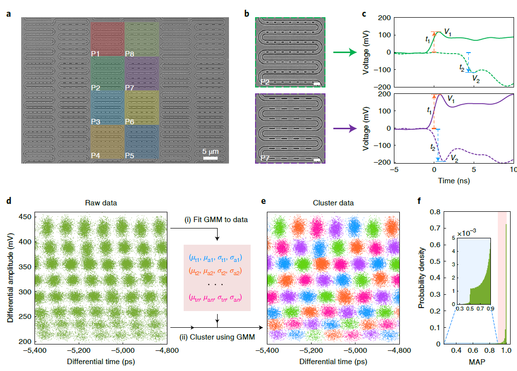 图1:基于OTAM读出方式的器件设计(a,b)、差分时-幅信号输出(c)、输出星座图(d,e,)以及读出可信度(大于97%)分布(f)。