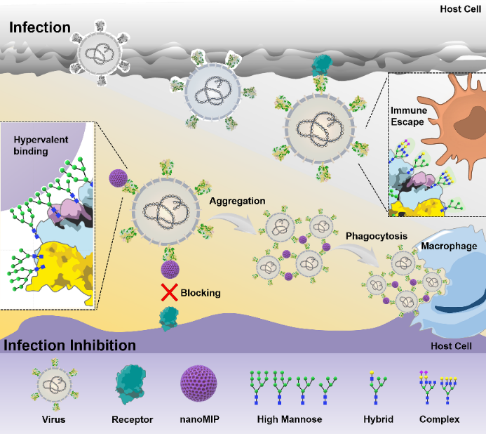 许多病毒,包括艾滋病毒、新冠病毒、甲型流感病毒、拉沙热病毒和埃博拉病毒,其蛋白质表面存在致密的聚糖屏蔽层,又被称之为"糖盾"。通过"糖盾"屏蔽免疫原性高的抗原表位这些病毒能逃避宿主的免疫监视的主要原因。在快速的增殖过程中,许多病毒的糖蛋白质在加工过程中跳过了高尔基体中复杂的糖基化修饰,在"糖盾"中保留了许多未经复杂加工的高甘露糖。因此,病毒"糖盾"的保守结构特征(丰富的高甘露糖)是应对不断变异的病毒以实现广谱抑制的潜在靶标。然而,糖类化合物具有非常相似的结构,糖的专一识别具有极大的挑战。