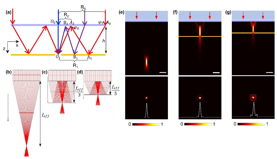 图3 pancake 超构透镜的模拟结果。 (a) pancake 超构透镜光线示意图。 (b)& (e) 普通超构透镜,(c)&(f) 压缩比为1/3的pancake超构透镜,(d)&(g) 压缩比为1/5的pancake超构透镜的光线追迹图和全波仿真结果。