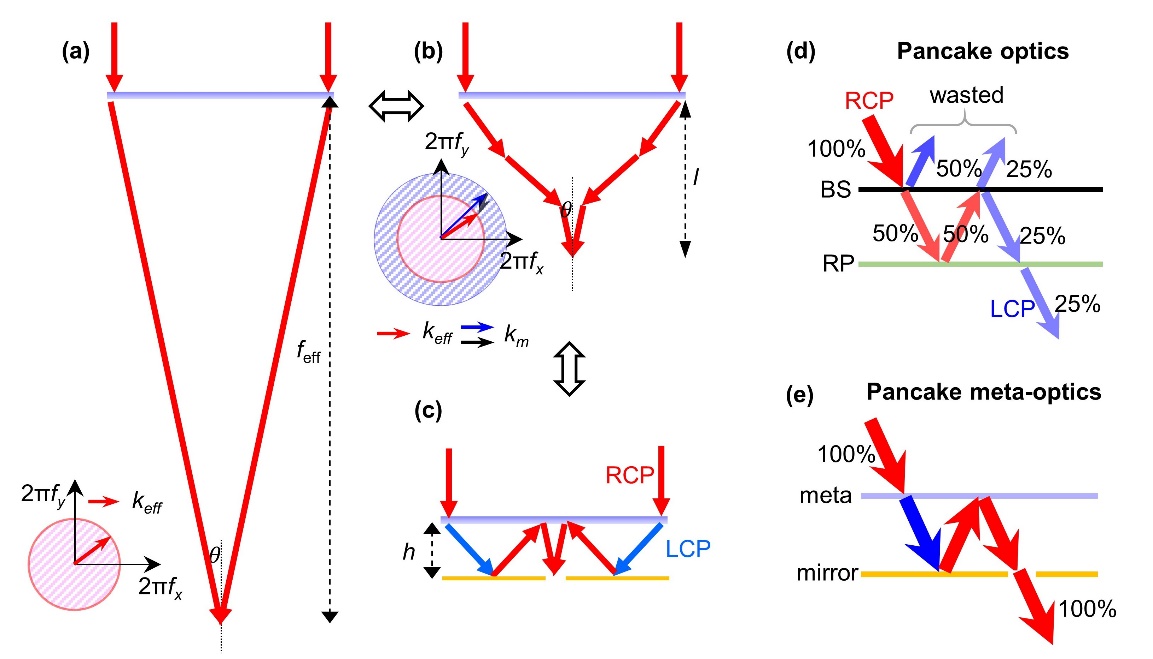 图2 pancake超构透镜的工作原理。(a)普通超构透镜的光线示意图,(b)多次波矢调制减小成像距离,(c)利用超构微腔进一步折叠成像距离;(d)传统pancake optics 能量利用示意图,(e) pancake meta-optics 能量利用示意图。