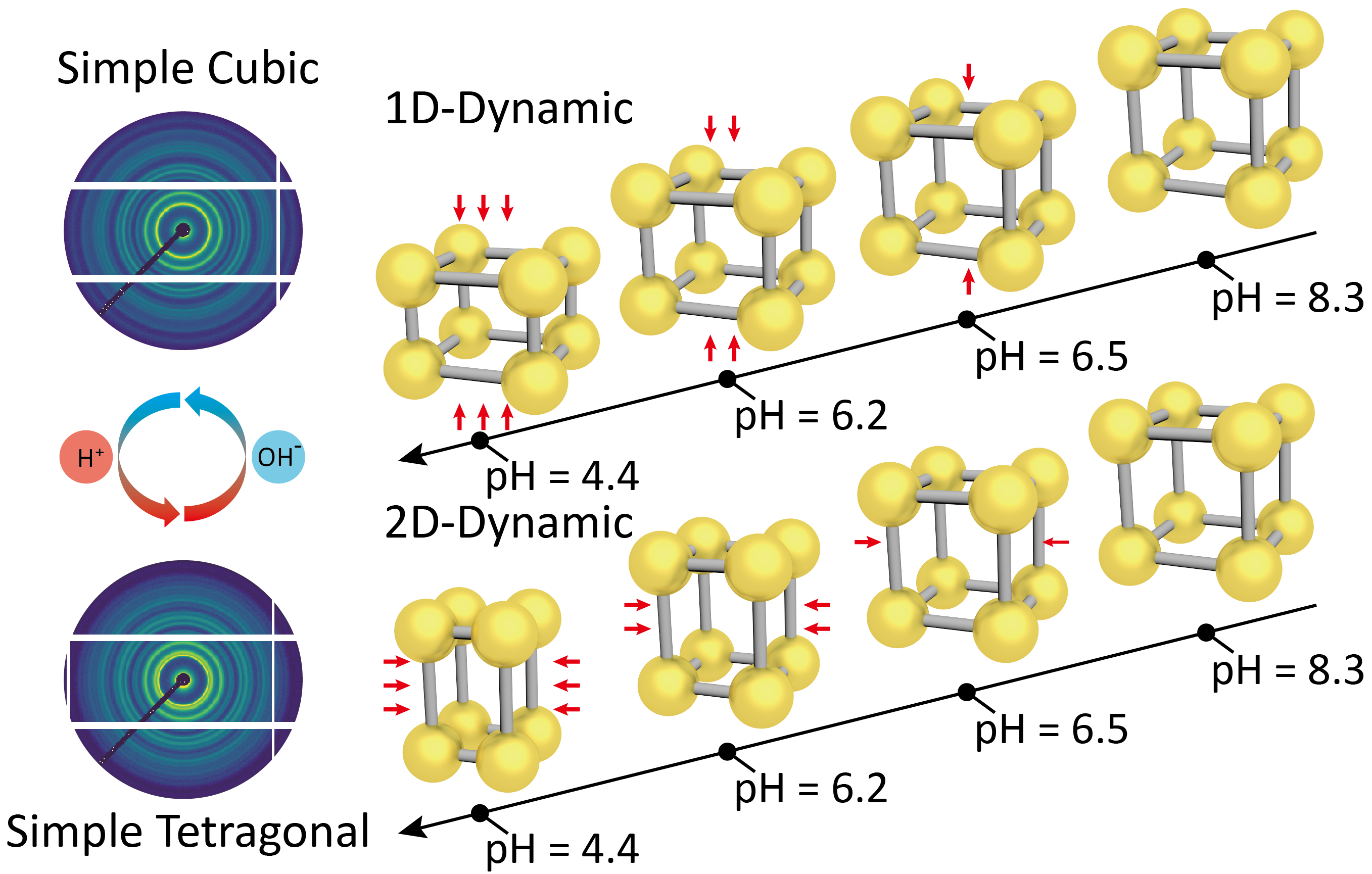 本工作以正八面体折纸框架为基本单元,在单体的不同维度定向嵌入pH响应序列与pH抗性序列,并编码不同的粘性末端保证序列的精准递送。通过这样的维度操控策略,本课题组成功合成了对pH变化响应的一维、二维、三维动态超晶格,以及对照组对pH变化响应非活的对照组零维静态超晶格。其中,一维、二维动态超晶格能够随pH环境变化,在简单立方与简单四方两相之间进行快速切换,而不需热处理辅助推进相变过程。这一工作的完成为后续构建多相态动态超晶格提供了实验基础,也提供了一种利用高对称性单体构建低对称性晶格的新设计思路。