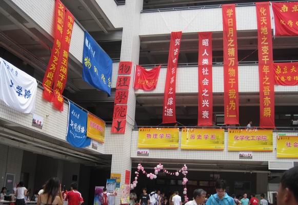 最壮观的场面要数迎新专车的停车处,那里聚集了每个院系的迎新队伍。每当一辆迎新车辆从校门口驶入,这一群三三两两分散的队伍就会以神速集合到路边,他们高举本院的标志牌,士气高昂,精神抖擞,大叫着本院的名称,吼着独具本院特色的迎新口号,喜滋滋地将新生带往大本营,然后再度返回,乐此不疲。相信所有走进校园的新同学和家长们都会被我们足足地震撼和感动了一把。
