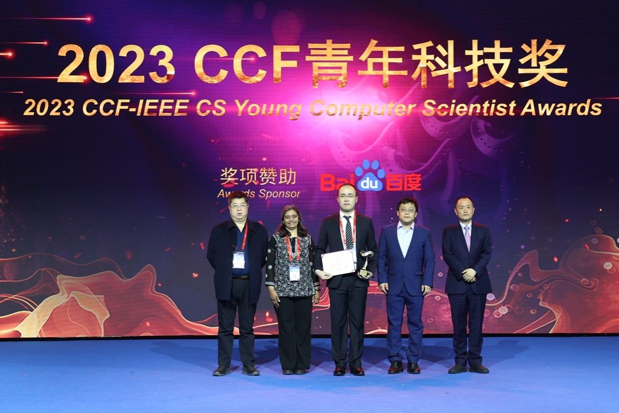 “CCF-IEEE CS青年科学家奖”授予在科学研究方面有突出成就和重要贡献、年龄不超过40岁的青年学者,该奖由中国计算机学会(CCF)和IEEE计算机学会(IEEE CS)共同评选和颁发。2023年全国仅五人获此殊荣。CCF理事长梅宏院士、CCF奖励委员会主席廖湘科院士、IEEE CS主席Nita Patel教授、百度高校合作部总监李轩涯先生为获奖者颁奖。