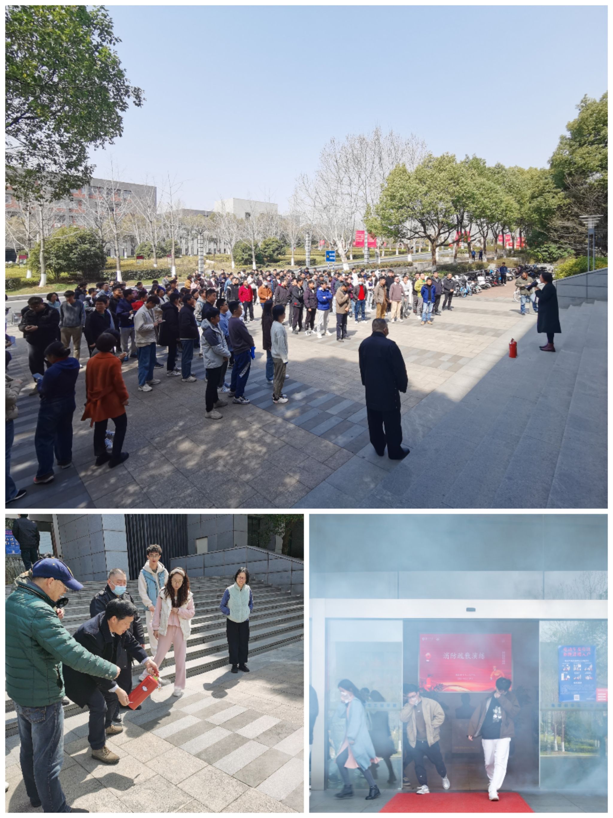 撤离结束后,师生聚集在院楼前的广场,进行此次消防疏散演练总结点评。董婷书记进行宣讲:“本次演练检验了应急联动机制和师生的自救自护意识,希望通过春季消防安全系列活动,进一步增强全体师生的消防安全意识和相关安全技能。上周集中观看了消防逃生公开课,学习了消防逃生的技巧和知识,今天的消防演练也是巩固和检验学习的成果。希望学院广大师生提高认识,在思想上加强重视,把生命安全放在首位,在教学、科研和学习中,在实验室、工作室、教室、宿舍等场所都要注意预防危险和识别隐患,做到知行合一,及时清理整改隐患,保障生命安全。”