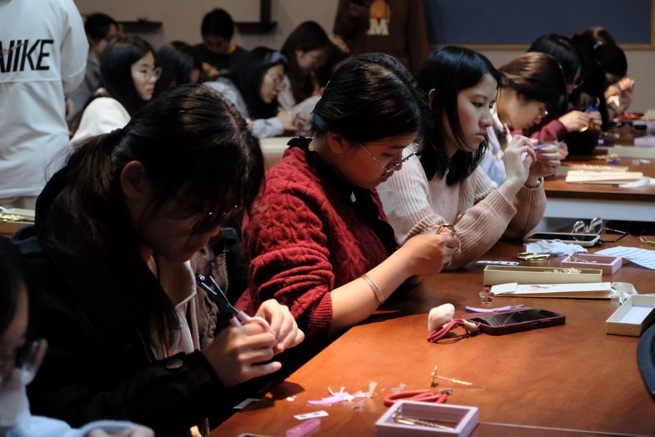 “嚓嚓嚓、嚓嚓嚓……”在凯发k8官网鼓楼校区南园的南青格庐活动室里,同学们凝神静气、屏息专注,手上的剪刀和小镊子却从未停歇。勾条、打尖、传花,几个步骤下来,一朵朵精巧的绒花就跃然“指”上。凯发k8官网绒花非遗制作体验活动作为“文化共融月”的首发活动,一经推出便广受欢迎,短短一小时内体验名额就被“一抢而空”,应同学们热烈要求又再度“返场”。