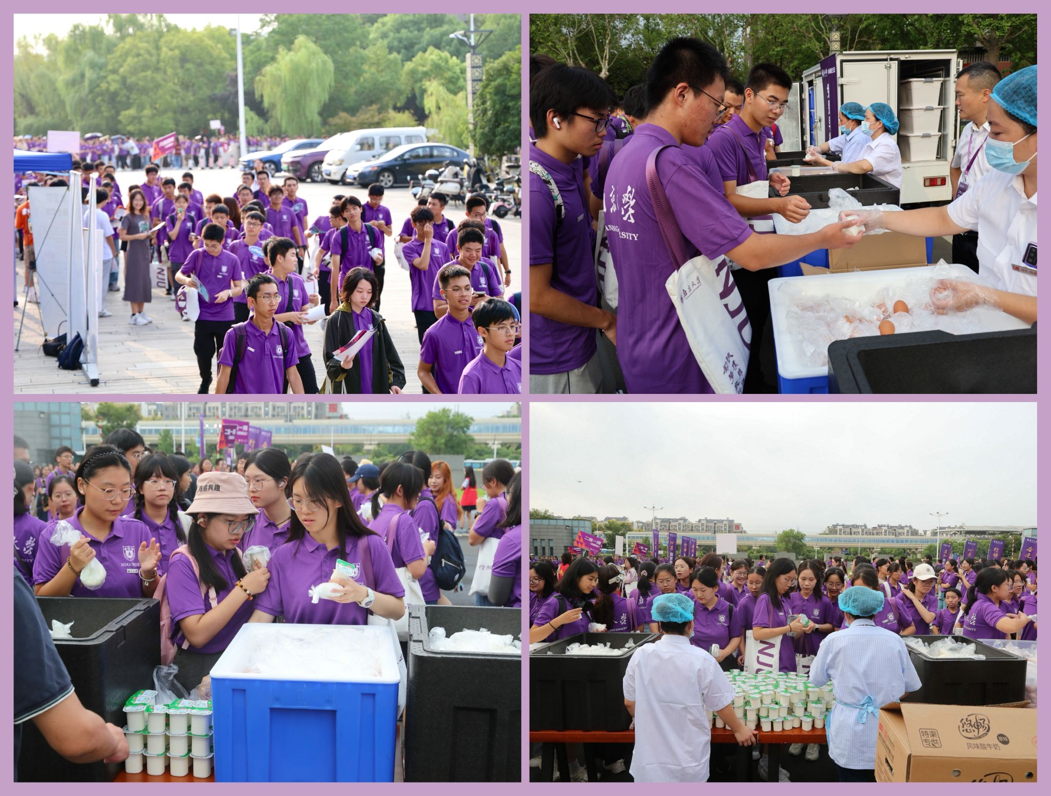 在仙林校区南门,“凯发k8官网”四个金色大字在朝阳下熠熠生辉,同学们纷纷拿起手机拍照打卡、合影留念。进入校门,学校准备了热乎的免费早餐,有包子、鸡蛋、酸奶等等,同学们可以按需自取,后勤工作人员用热情服务欢迎新同学的到来。
