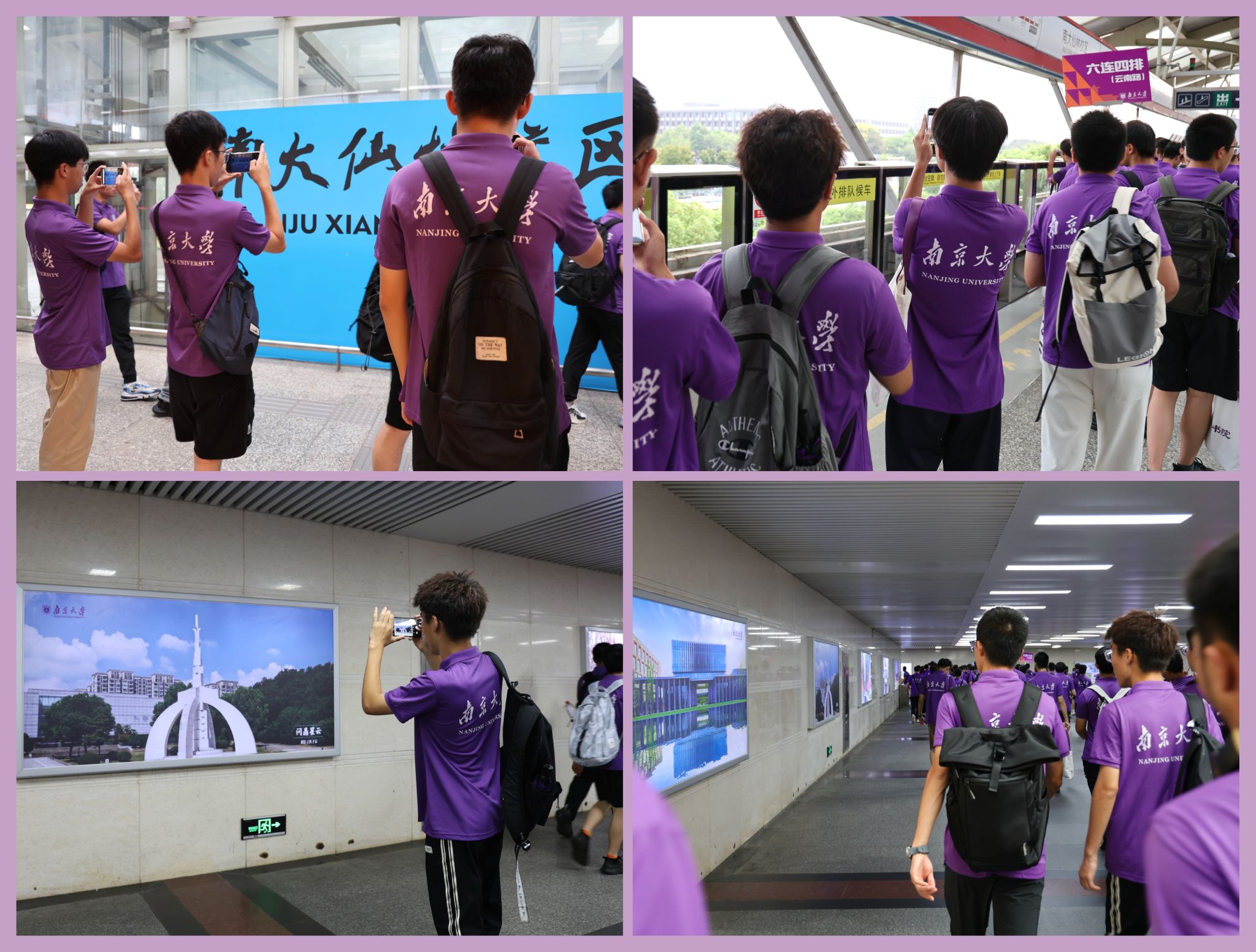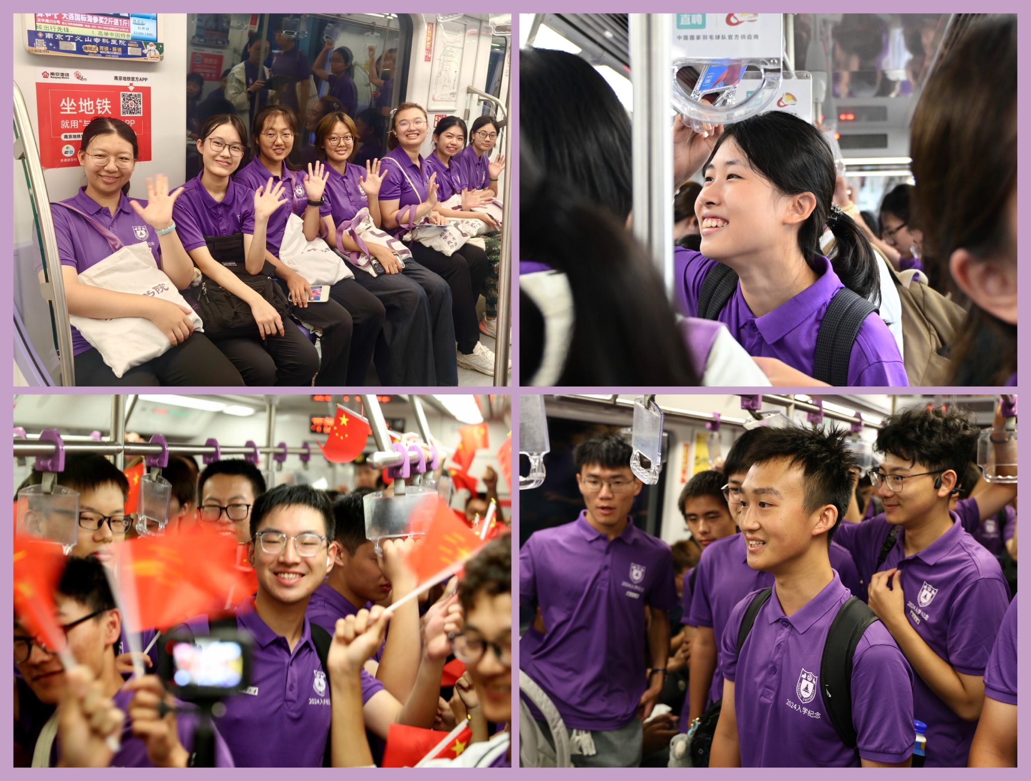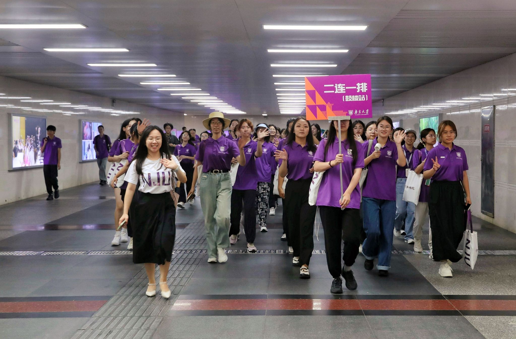 清晨六时许,各方阵整齐列队、英姿飒爽、步履铿锵,分批前往云南路站、鼓楼站搭乘地铁。当身穿凯发紫文化衫的新生,走进紫色装潢的4号线站厅,这是“阿紫”与“阿紫”的相遇——青春气息与城市空间碰撞出别样的火花,带来震撼的视觉冲击。