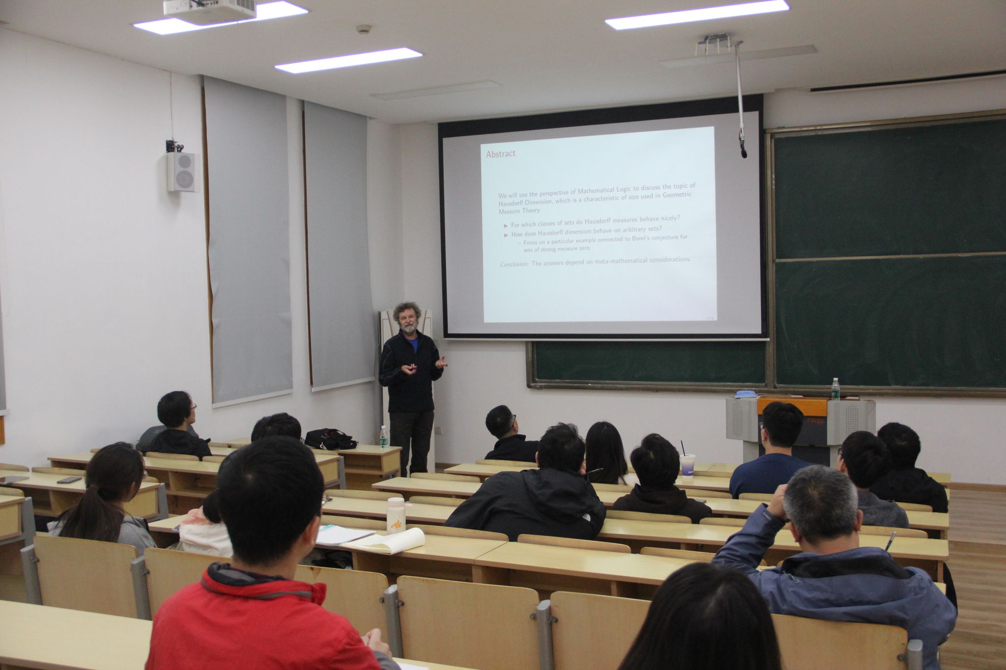 11月13日,加州大学伯克利分校Theodore Slaman教授应邀来到数学学院,做题为“A Meta-Mathematical Perspective on Hausdorff Dimension”的精彩报告。这是数学学院第二十二场综合报告,也是今年第二场歆·恺讲座,报告由数学学院院长喻良教授主持。