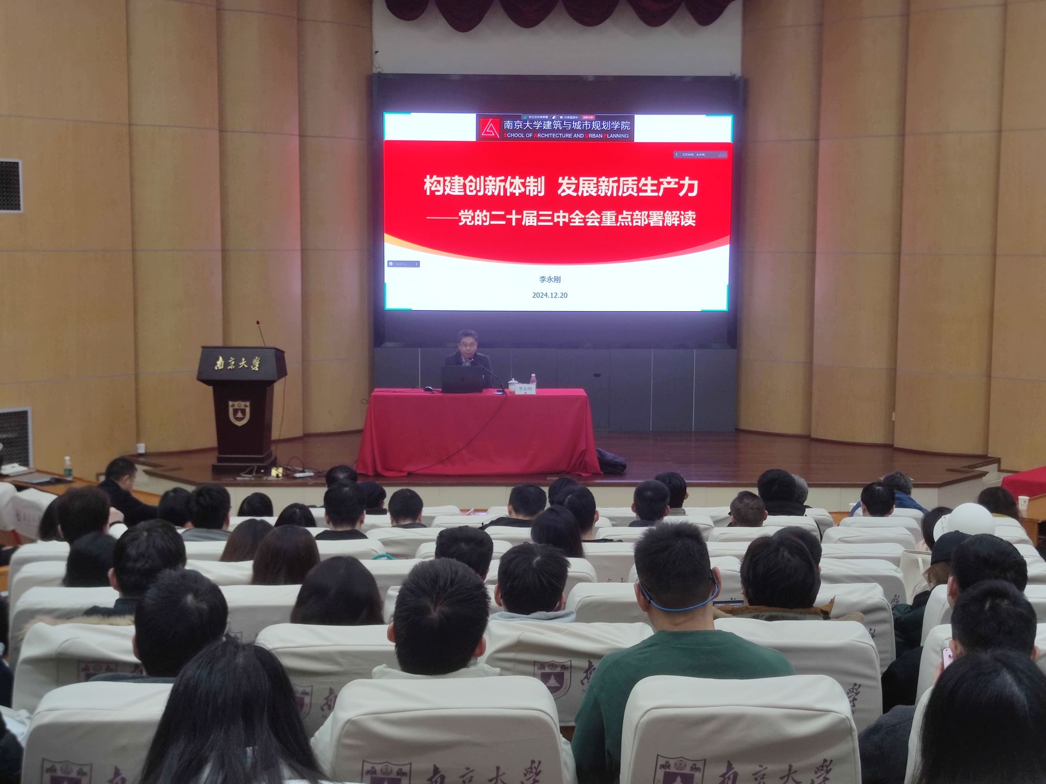 为深入学习贯彻党的二十届三中全会精神,认真落实学校党委关于师生党员基本培训的部署要求,12月20日,建筑与城市规划学院邀请学校理论讲师团成员、政府管理学院教授李永刚为全院师生党员讲授题为“构建创新体制 发展新质生产力——党的二十届三中全会重点部署解读”的专题辅导报告。报告会由学院党委书记印兴波主持,全院党委理论中心组成员、全体师生党员、发展对象及部分入党积极分子共四百余人,分别在鼓楼校区和浦口校区参加培训。