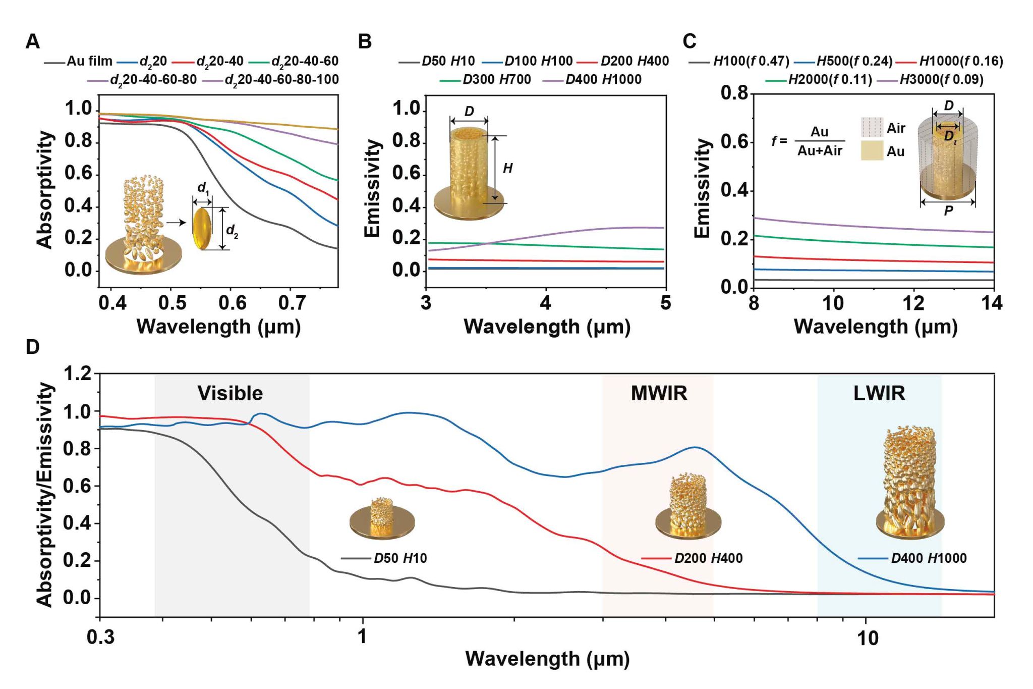 Fig. 2. Simulated absorptivity/emissivity spectra of the NPAHP-based skin-like metamaterial with different structural designs. (A) Dependence of the absorptivity/emissivity on the Au NPs size distribution in the visible band. (B)  Dependence of the absorptivity/emissivity on the D and H of Au hollow pillars in the MWIR band. (C) Dependence of the absorptivity/emissivity on the Au ratio (f) in the LWIR band. (D) Full-wave electromagnetic simulation for three representative structure models over 0.3-18 μm.