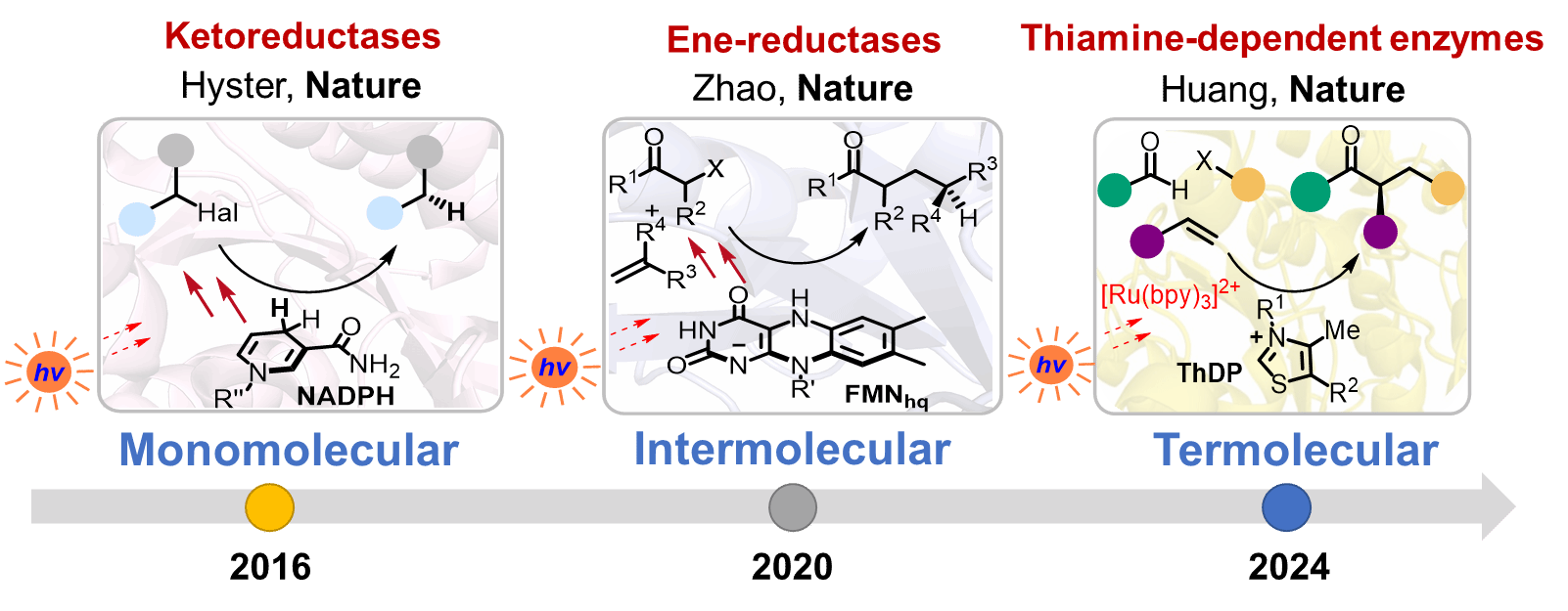The research group led by Dr. Xiaoqiang Huang at the School of Chemistry and Chemical Engineering, Nanjing University, has engineered thiamine pyrophosphate-dependent enzymes and developed a photobiocatalysis system, unlocking a new-to-nature three-component radical biocatalysis. This work, titled Synergistic photobiocatalysis for enantioselective triple radical sorting, was published online in Nature on November 22, 2024. Link to the paper: https://www.nature.com/articles/s41586-024-08399-5