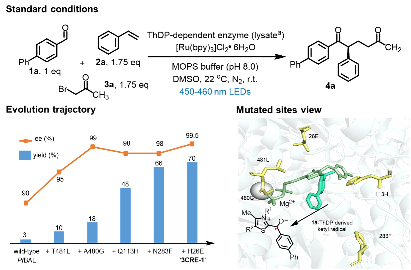 Addressing these issues, Dr. Huang Xiaoqiang’s team utilized visible light excitation and protein engineering to “reshape” the benzaldehyde lyase into a three-component radical enzyme (3CRE), achieving a non-natural high enantioselective three-component radical coupling reaction. They also elucidated the mechanism of this new function through mechanistic experiments. This system can combine three variable substrates, greatly enriching the diversity of photobiocatalysis and marking a significant achievement in the field (Figure 1).