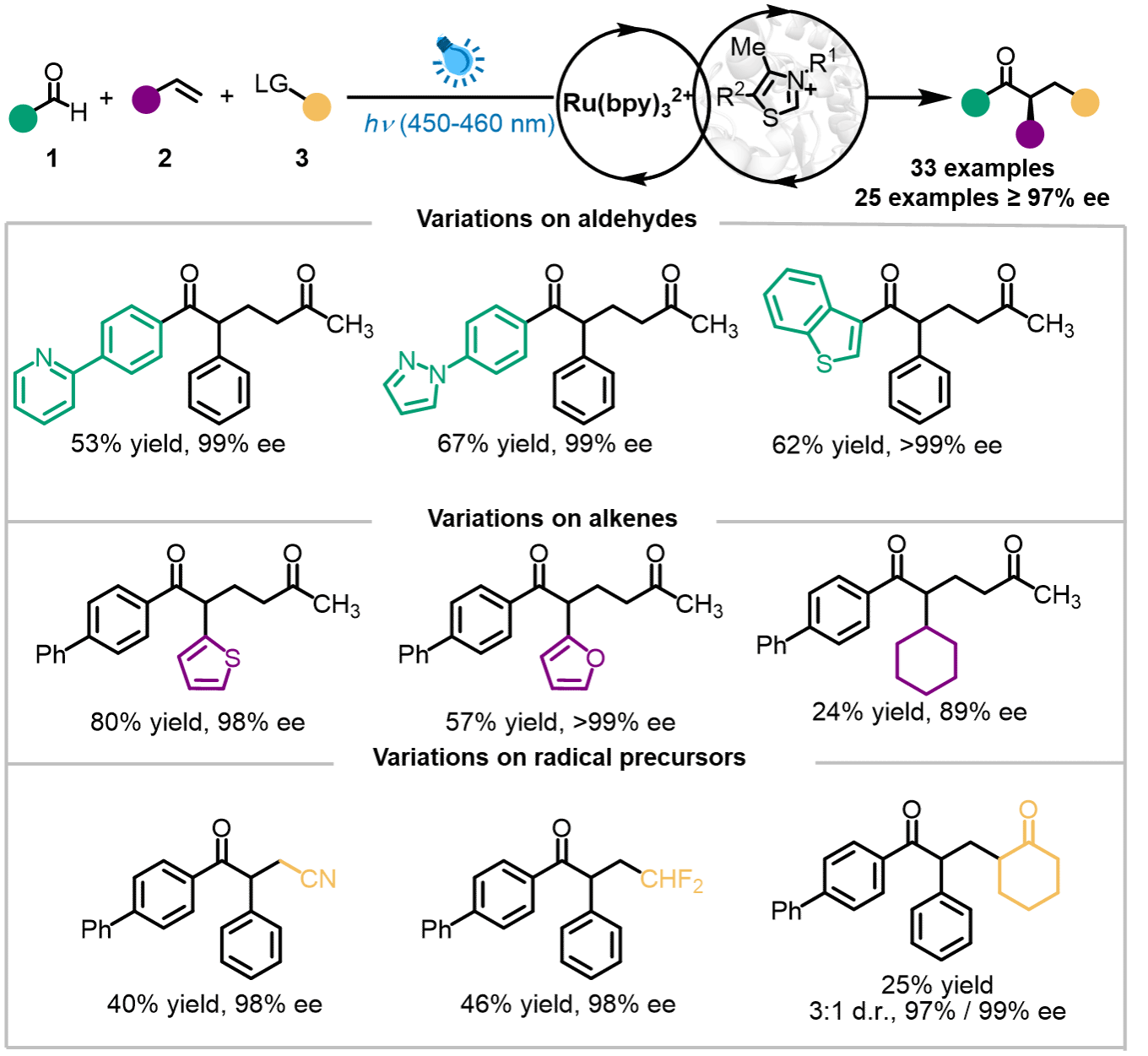 The photobiocatalysis exhibited excellent substrate tolerance, accepting a wide range of substituted aromatic aldehydes, heterocyclic aromatic aldehydes, various substituted aryl olefins, even alkyl olefins, as well as multiple alkyl radical precursors (Figure 3). The study presented 33 examples, of which 25 achieve ≥97% enantiomeric excess (ee), highlighting the power of the enzyme’s tunable active site in controlling the stereochemistry of free radicals.