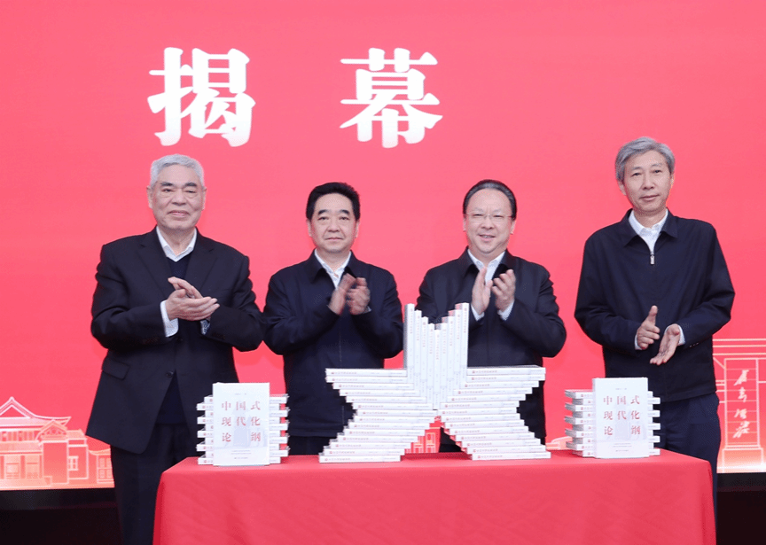 Zhang Aijun, Tan Tieniu, Hong Yinxing, and Sun Zhenfu, Secretary of the CPC Jiangsu Phoenix Publishing & Media Group Committee jointly launched The Chinese Path to Modernization. Xu Hai, Deputy General Manager and Editor-in-Chief of Jiangsu Phoenix Publishing & Media Group, introduced the planning and publishing process of this book. Lin Haitao, Deputy General Manager of Phoenix, presented a copy of the book to Huang Xianjin, Director of Nanjing University Library, as a gift. The ceremony was hosted by Wang Baoding, President of Jiangsu People's Publishing House.