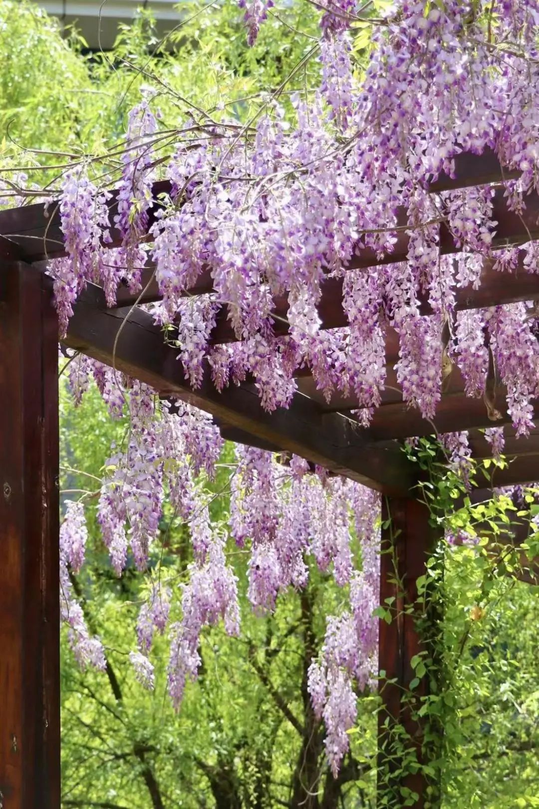 At first glance, the garden is extremely narrow, but a few dozen steps through the wisteria corridor