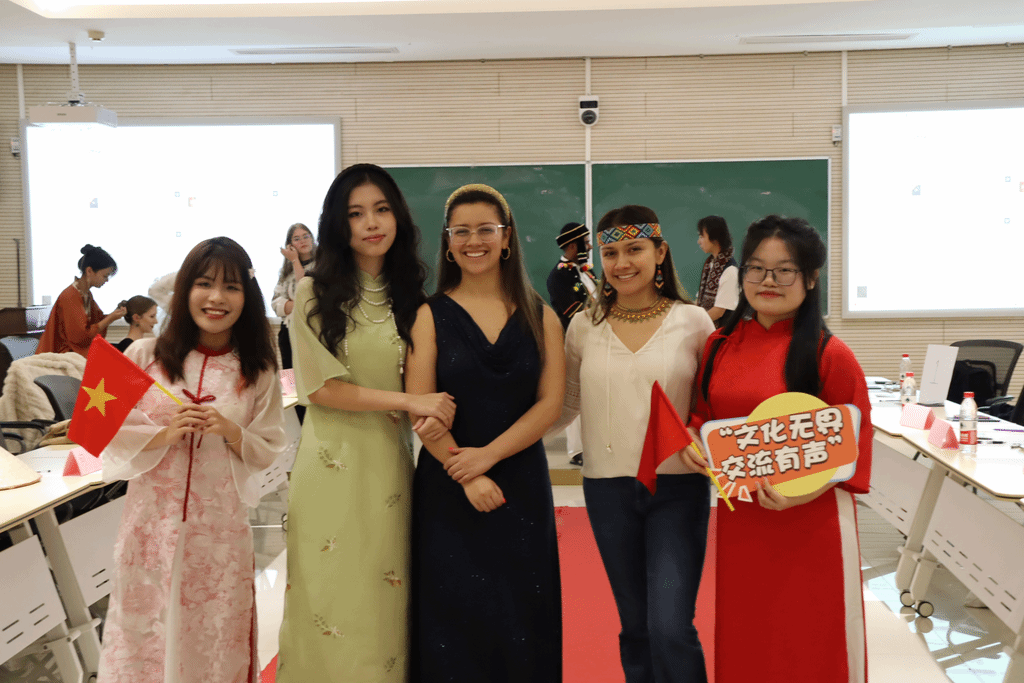 To kick off the event, participants introduced their traditional clothing, discussing its historical significance and cultural symbolism. Vietnamese students showcased the elegant Ao Dai, Colombian students introduced the vibrant Pollera and Mola, and Pakistani students presented the traditional Shalwar Kameez along with the intricate Henna art. Chinese students also provided insights into modern adaptations of traditional Hanfu, inviting international students to try on Mamian skirts, which generated enthusiastic engagement.