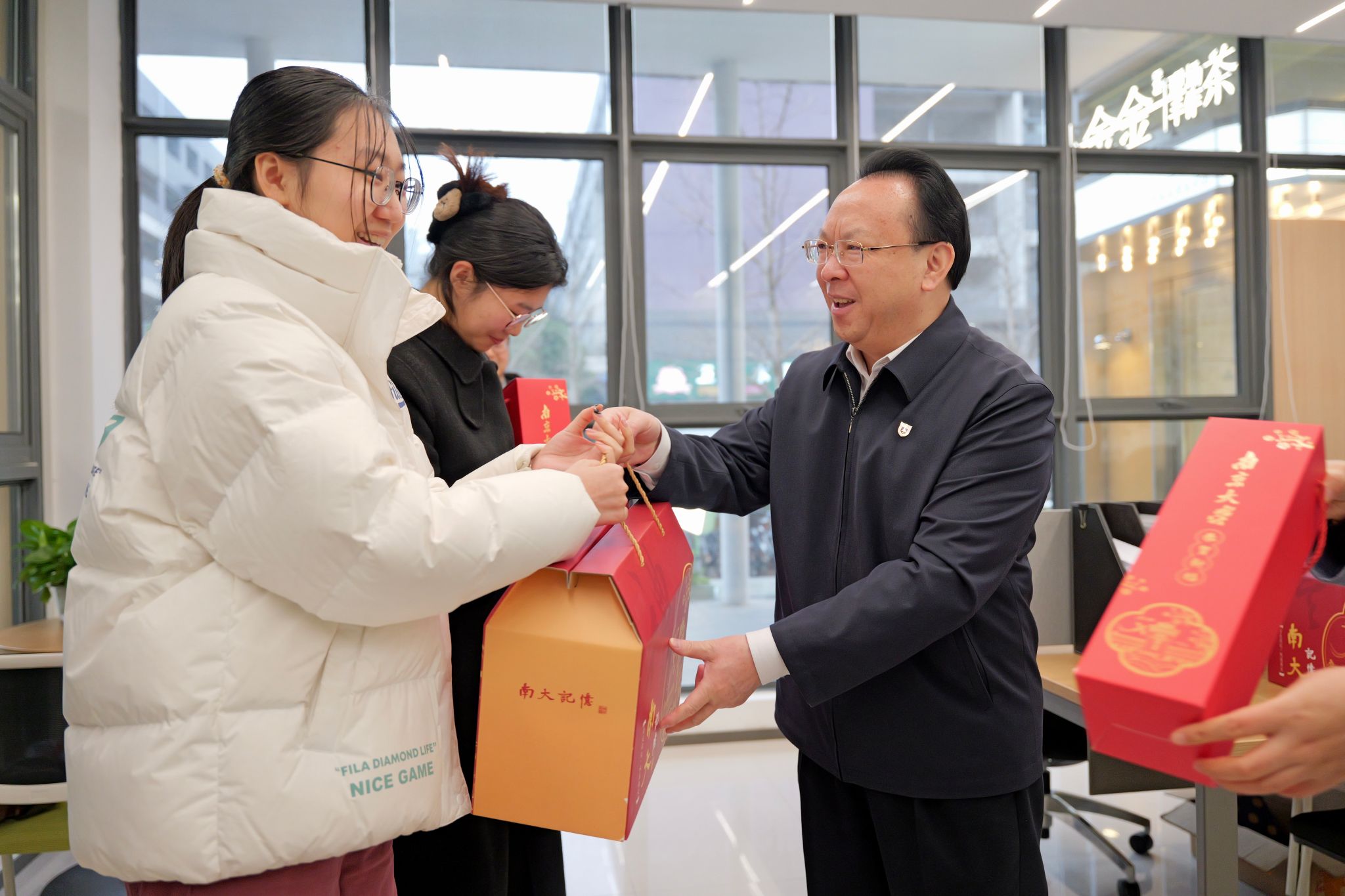 On January 26, as the Chinese New Year is approaching, Tan Tieniu, Chair of NJU CPC Council and Academician of the Chinese Academy of Sciences visited teachers, students and staff staying on campus and sends his warmest regards to them. Tan firstly visited dormitories and exchanged with students. While sending them New Year gift packages, he said to them that NJU is students' family, hence the university will make careful arrangements and make sure every student can enjoy the Spring Festival just like at home.