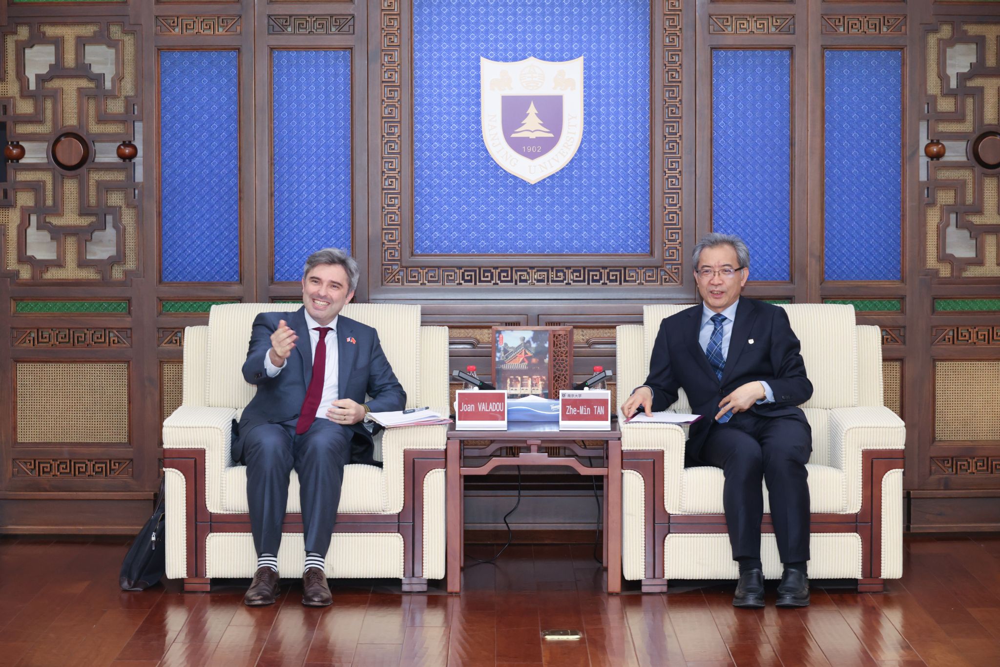 Tan Zhemin welcomed Joan Valadou and his delegation. He introduced the basic situation of NJU from the aspects of her history, faculty, research and innovation, and experience of open school running. He pointed out that NJU attaches great importance to international exchanges and cooperation, and has long carried out extensive and in-depth cooperation with a number of French universities and scientific research institutions in geosciences, astronomy, architecture and other fields, which have achieved remarkable results and produced far-reaching impacts. Looking ahead, he expects NJU to further strengthen cooperation with all sectors of French society in talent training, mutual visits of teachers and students, scientific research projects, so as to enhance the understanding of Chinese and French cultures among young students of the two countries, and to promote the exchanges and mutual understanding of civilizations.