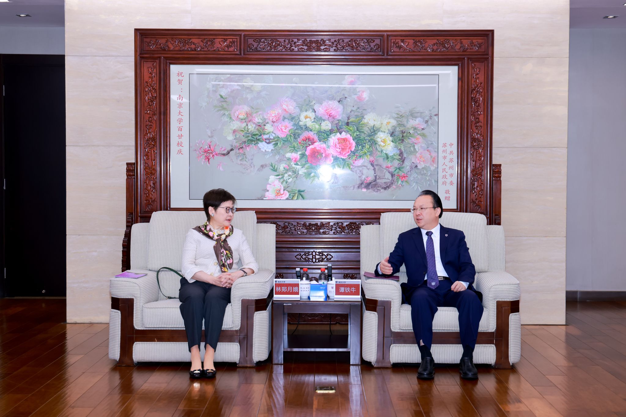 On behalf of the university, Tan Tieniu extended a warm welcome to Carrie Lam and Sophia Dan, and expressed heartfelt gratitude for their longstanding support for NJU. He introduced the latest development of the university. He highlighted the university's commitment to promoting collaboration between Jiangsu and Hong Kong. In recent years, NJU has strengthened its exchanges with Hong Kong and deepened its cooperation with various sectors of Hong Kong society. Tan expressed his hope to further enhance this cooperation, combining the wisdom of Jiangsu and Hong Kong to advance talent cultivation, research innovation, and cultural exchange.
