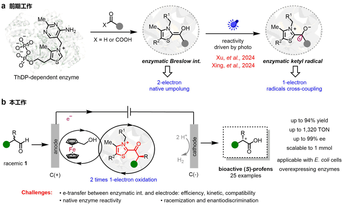 The integration of electrochemistry with enzymes has primarily been limited to replicating previously established enzyme functions. A breakthrough by Xiaoqiang Huang’s research group at the School of Chemistry and Chemical Engineering, Nanjing University, now transcends this limitation. By repurposing thiamine-dependent enzymes through ferrocene-mediated electrocatalysis, the team has unlocked a previously inaccessible dynamic kinetic oxidation of α-branched aldehydes. This robust electroenzymatic approach yields various bioactive (S)-profens with up to 99% enantiomeric excess, is applicable with whole cells overexpressing the enzyme and using down to 0.05 mol% enzyme loadings. Published online in Nature under the title "Electricity-driven enzymatic dynamic kinetic oxidation". This work opens up a new direction for asymmetric electroenzymatic catalysis.
