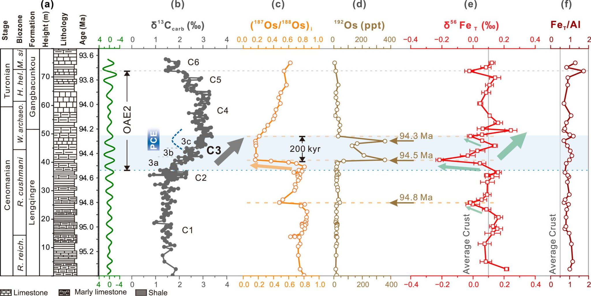 Oceanic Anoxic Event 2 (OAE2) was a major environmental crisis that took place about 94 million years ago in the mid‐Cretaceous greenhouse world, when global ocean oxygen levels dropped sharply. This loss of oxygen led to disruptions in marine ecosystems, widespread organic carbon burial and changes in the carbon cycle. Scientists believe OAE2 was triggered by a surge in ocean nutrients—possibly from underwater volcanic activity associated with large igneous province (LIP) formation in oceans or increased rock weathering on land—which fueled massive algal blooms. However, the exact cause (submarine LIP volcanism vs. continental weathering) has been controversial. To resolve this, researchers from School of Earth Sciences and Engineering, Nanjing University studied iron isotopes of rocks from the Gongzha section, southern Tibet, China that preserves a well‐dated, high‐resolution OAE2 record. Iron is a key nutrient, and its isotopes can reveal whether it came from submarine LIP volcanism or land sources, as well as how much was used by marine life. The results show that iron isotope shifts match patterns of volcanic iron input and increased biological uptake (Fig. 1). Similar trends appear in other OAE2 records worldwide (Fig. 2), suggesting a global volcanic trigger. Hence, LIP‐related underwater eruptions—not weathering—was likely the major source of increased nutrients that sparked OAE2.
