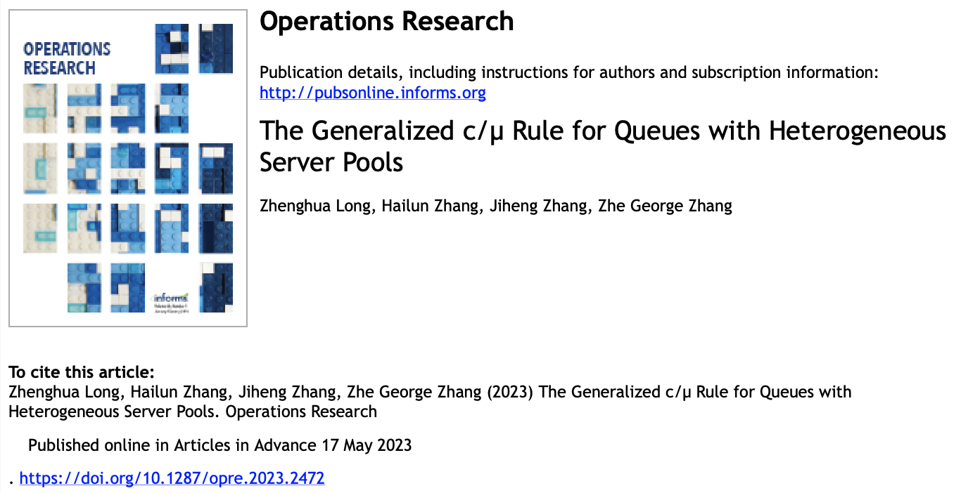 Recently, the research paper titled “The Generalized c/μ Rule for Queues with Heterogeneous Server Pools”, of which Zhenghua Long is the first author, was accepted and published online in the UTD24 international journal Operations Research (https://doi.org/10.1287/opre.2023.2472). The three co-authors of this paper are Assistant Professor Zhang Hailun of the Chinese University of Hong Kong (Shenzhen), Professor Zhang Jiheng of the Hong Kong University of Science and Technology, and Professor Zhang Zhe of Western Washington University.