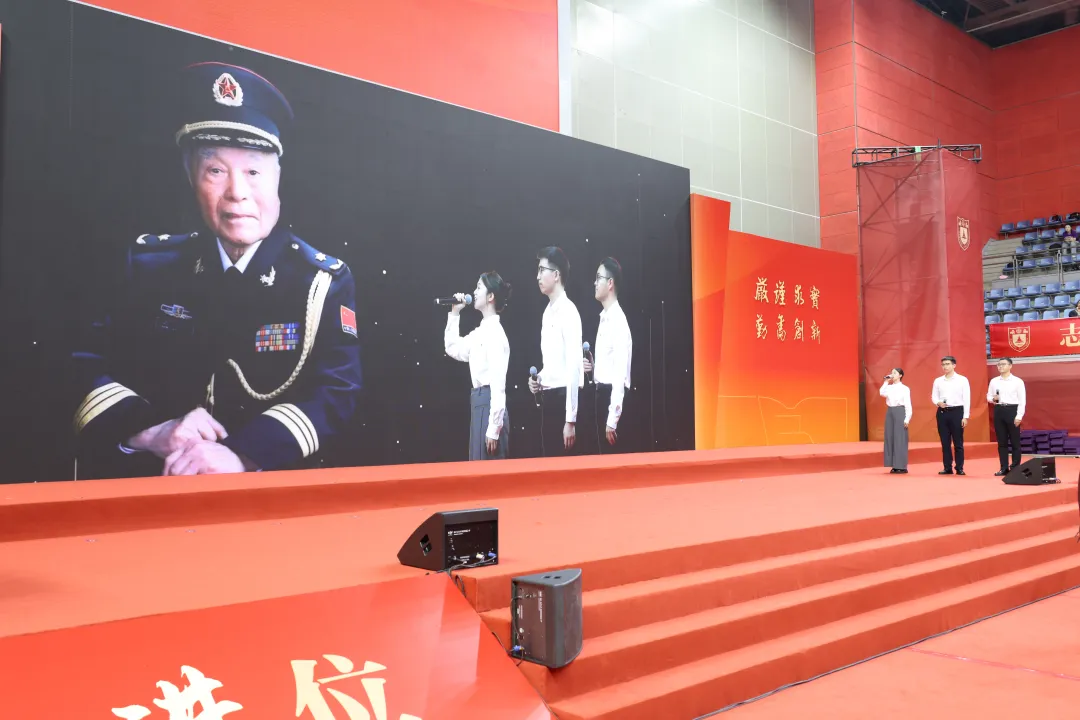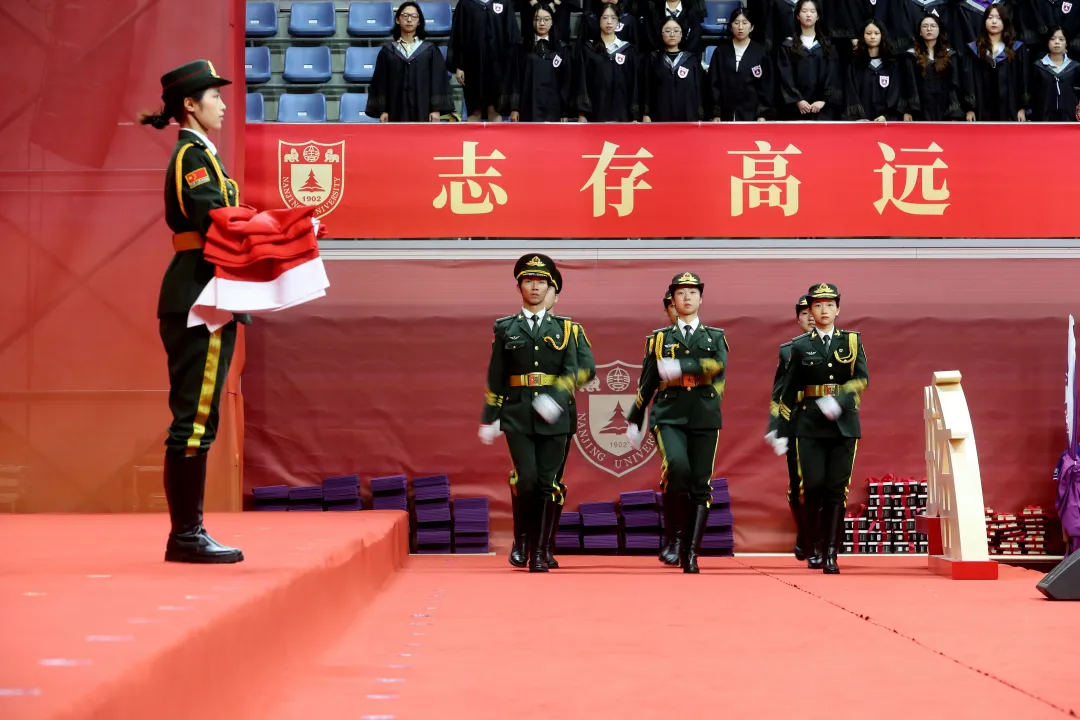 Around 2 p.m., members of the NJU's National Flag Guard solemnly escorted the Five-starred Red Flag into the venue. The Five-starred Red Flag has a close connection with Nanjing University, having been designed by alumnus Zeng Liansong. This flag once flew high over Tiananmen Square and was specially escorted to NJU for its 110th anniversary in 2012. All attendees paid tribute to the flag and sang the national anthem, marking the official start of the ceremony.