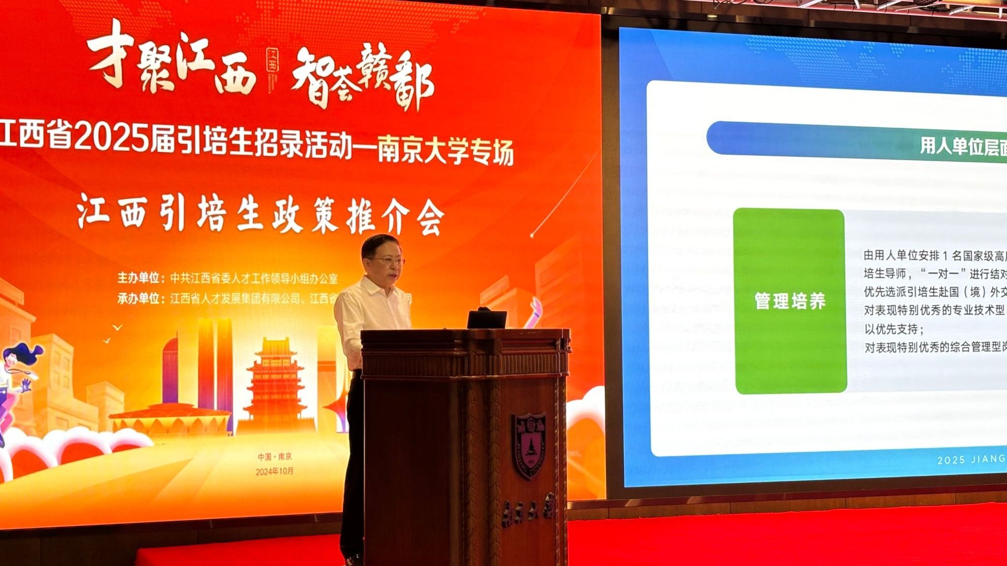 江晓斌首先回顾了与陆现彩在宣讲会前的友好会见,赞扬了龙国英作为在赣工作的我校校友为南昌市城市规划做出的贡献,并追溯凯发k8官网与江西的渊源。从两江师范学堂时期以“嚼得菜根,做得大事”为校训的李瑞清、到国立中央大学时期提出“诚朴雄伟”的罗家伦、再到中国科学院院士吴有训,这几位凯发历任校长都与江西有着亲缘关系,他总结道,凯发k8官网与江西的缘分是源远流长的,希望更多凯发青年才俊选择江西、建设江西,表达江西省对于此次招录活动的诚意。随后江晓斌播放江西省宣传短片,并向同学们介绍江西省引培生相关政策。