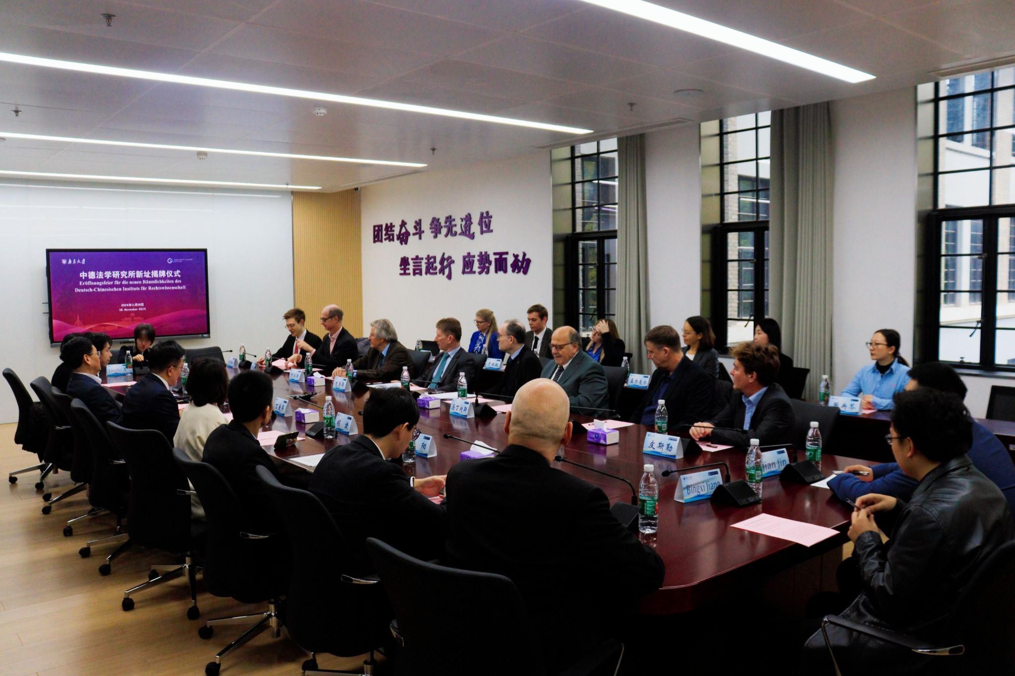 在热烈的氛围中,与会嘉宾为中德法学研究所新址揭牌,这标志着双方合作办学新篇章的开启。