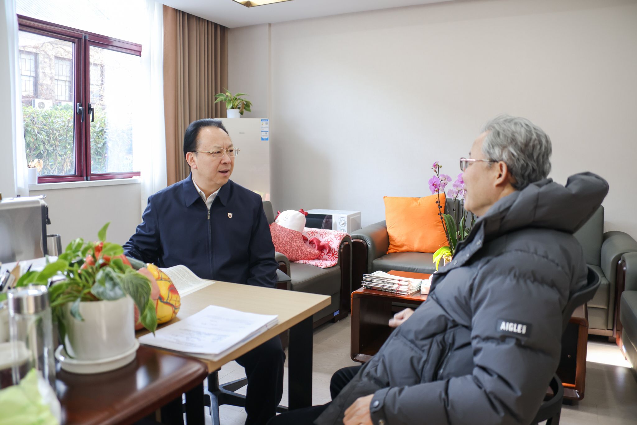 在电镜中心,谭铁牛向中国科学院院士、医学院教授顾宁致以节日祝福,感谢他在科研教学方面作出的贡献,勉励顾院士及其团队继续发挥专长,攻克更多医学难题,培养更多医学人才,促进更多成果转化,造福人民群众。顾院士感谢学校党委的关心关怀,并表示花甲之年大有可为,在科研工作上将继续勇攀高峰、任重道远。