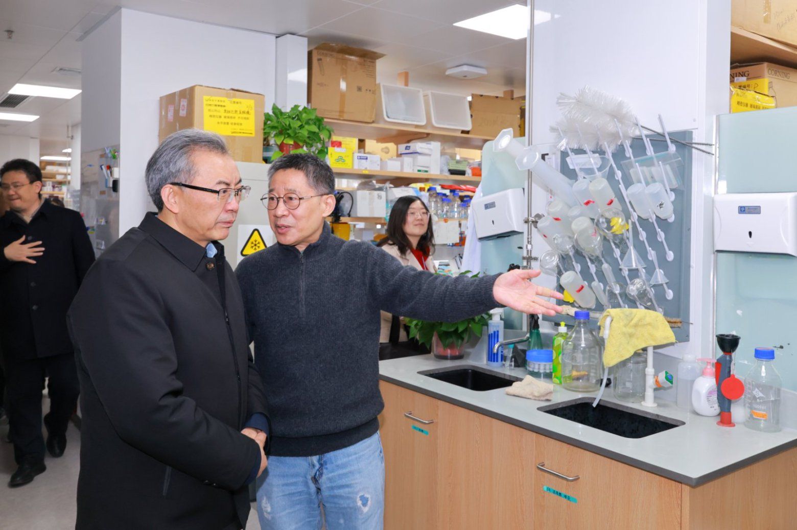 在化学楼,谭铁牛一行察看了教学实验室安全管理情况。在化学实验交流中心,他勉励大家新的一年继续努力,牢固树立安全红线意识,全力保障师生员工的生命财产安全。在医学院分子实验室和学生研修室,他询问大家的科研工作进展和生活近况,勉励大家锚定目标、坚定信心,久久为功、步步深入,必有所获、必有所成。