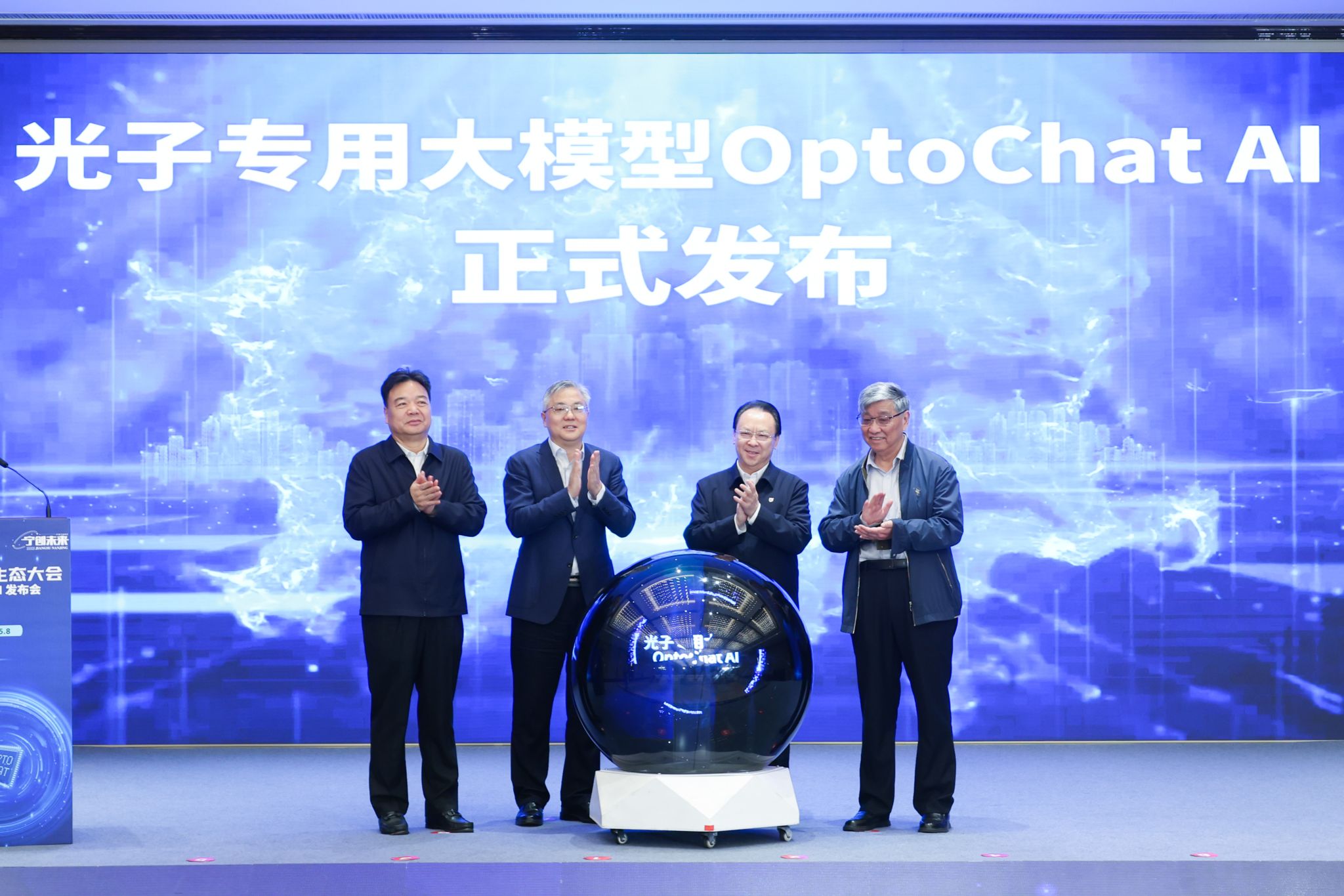 大会现场,周红波、谭铁牛、陆卫东、祝世宁共同启动OptoChat AI光子专用大模型发布仪式