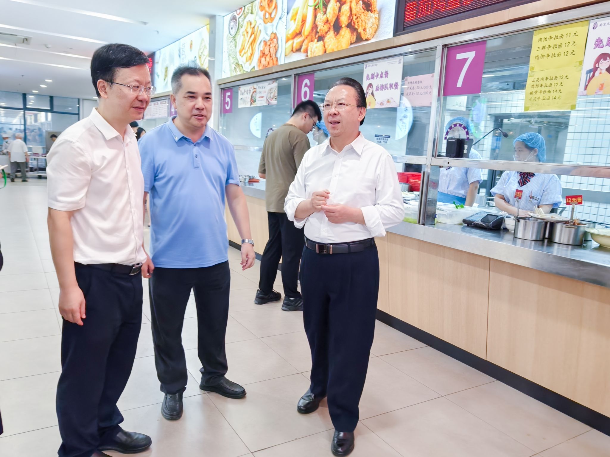 来到食堂,谭铁牛深入了解了第一食堂的改造进展和第二食堂的师生用餐情况。他强调,要持续加强食堂安全卫生管理,严格抓好食品加工、餐具消毒等每一个细节,在用餐时段及时清理桌面,时刻为师生提供干净舒适的用餐环境。